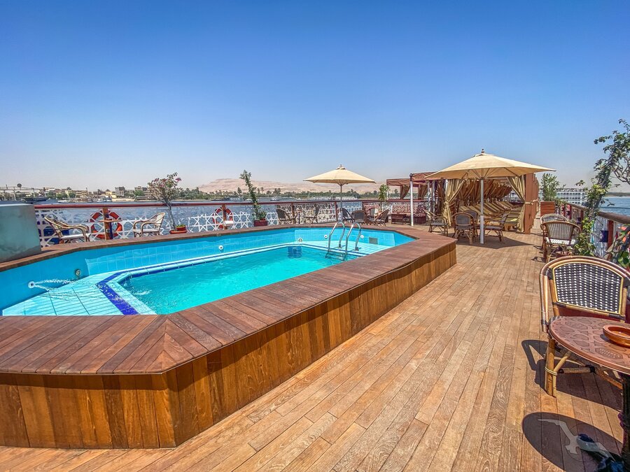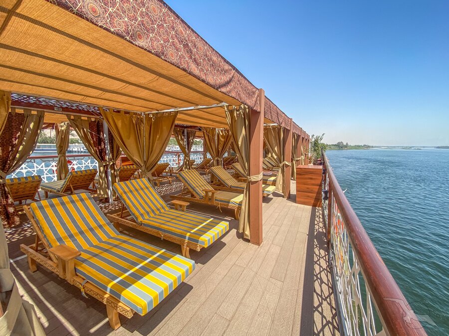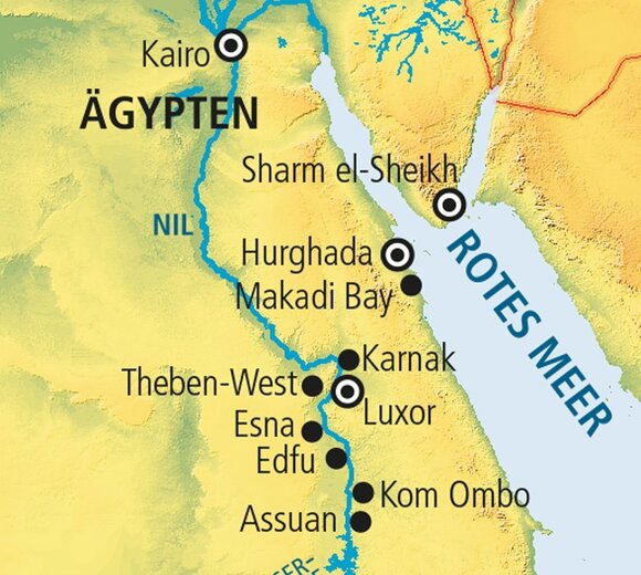 Luxor und Assuan an der Nilpromenade und in Kairo im Stadtteil Maadi. Je nach Aufkommen kann es an den Anlegestellen dazu kommen, dass mehrere Nilschiffe nebeneinander liegen, sodass die Sicht behindert sein kann und Geräusche/Gerüche von Nachbarschiffen nicht ausgeschlossen sind.