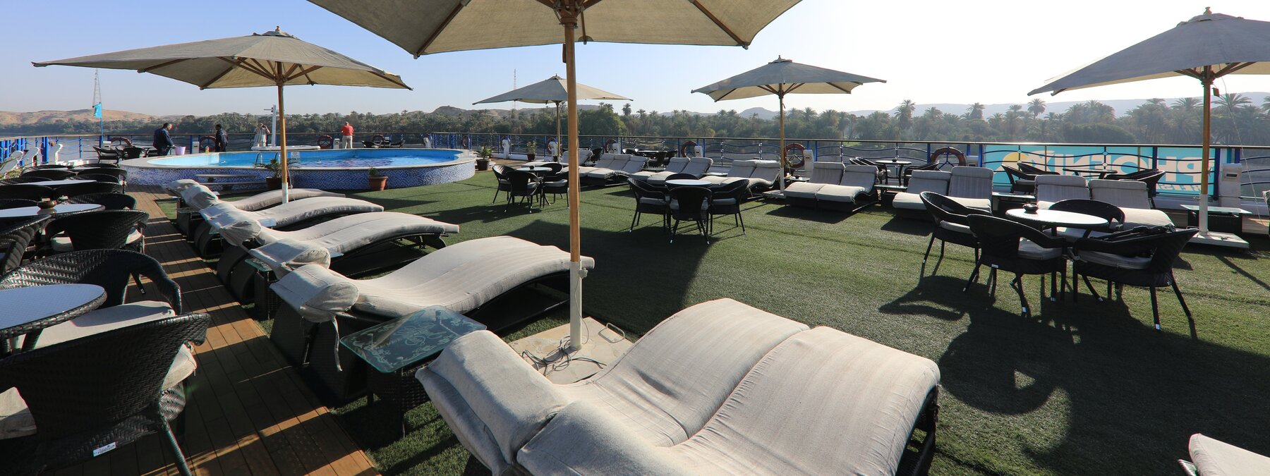 Luxor und Assuan an der Nilpromenade und in Kairo im Stadtteil Maadi. Je nach Aufkommen kann es an den Anlegestellen dazu kommen, dass mehrere Nilschiffe nebeneinander liegen, sodass die Sicht behindert sein kann und Geräusche/Gerüche von Nachbarschiffen nicht ausgeschlossen sind.