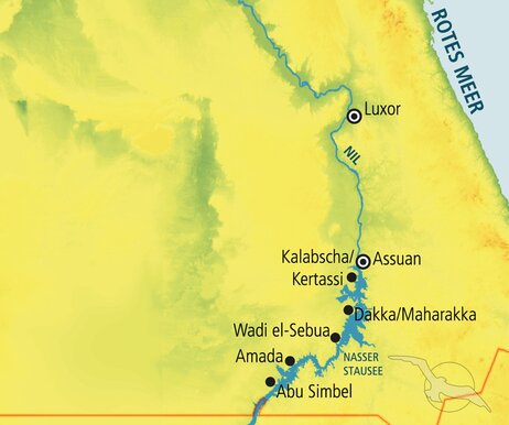 Nach dem Frühstück besuchen Sie im „Tal der Löwen“ die Tempelanlagen von Wadi el-Sebua. Auch hier wurden die beiden Weihstätten von Dakka und Maharakka durch die Flutung des Sees an einen neuen Ort des Westufers versetzt. Anschließend setzen Sie die herrliche Fahrt durch das trockenwarme Klima der Wüste fort und genießen bei einer Tasse Tee den erholsamen Turn.