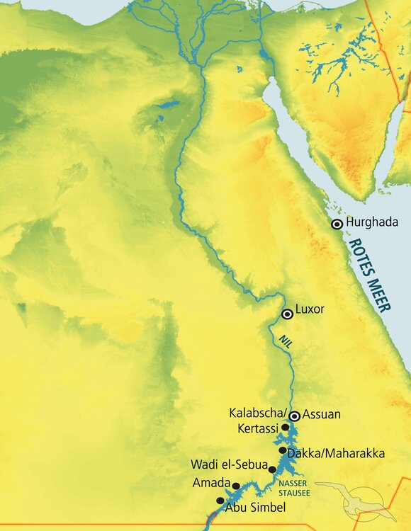 Morgens besuchen Sie den Kalabscha-Tempel, der wie die berühmten Tempelanlagen von Abu Simbel versetzt und auf einer kleinen Insel des künstlichen Stausees neu errichtet wurde. Anschließend sehen Sie den nebenstehenden Kiosk von Kertassi aus der griechisch-römischen Epoche. Am Vormittag beginnt Ihre Kreuzfahrt auf dem gewaltigen Stausee. Sie genießen die Vorzüge an Bord und erholen sich auf dem großzügig und komfortabel eingerichteten Sonnendeck.