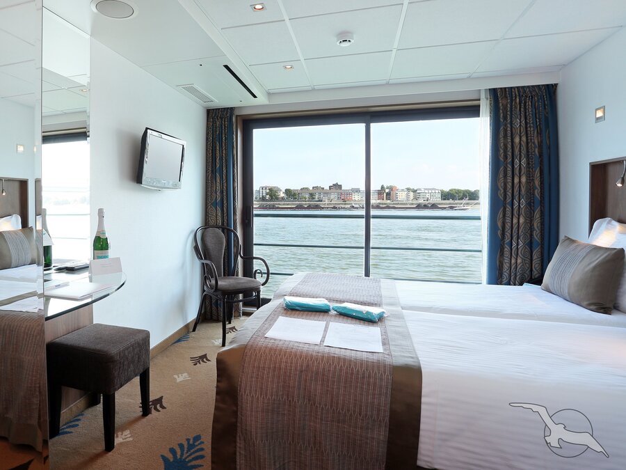 Alle Kabinen liegen außen, sind komfortabel und elegant eingerichtet mit französischem Balkon, raumhoher Fensterfront und Schiebetür. Die Betten lassen sich wahlweise als Doppel- oder Einzelbetten stellen.