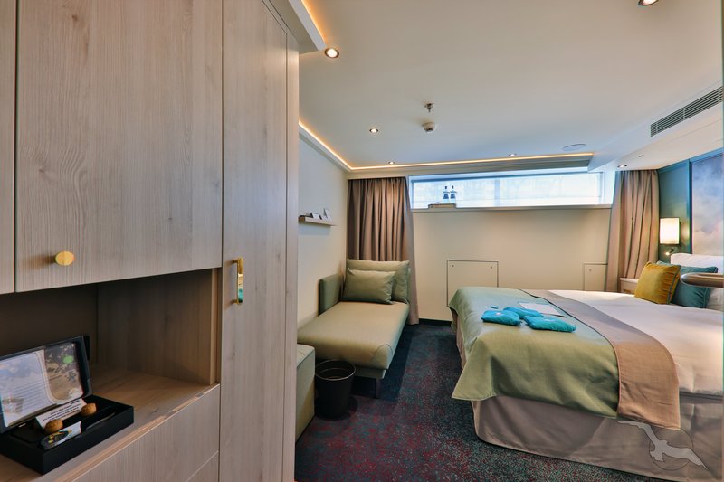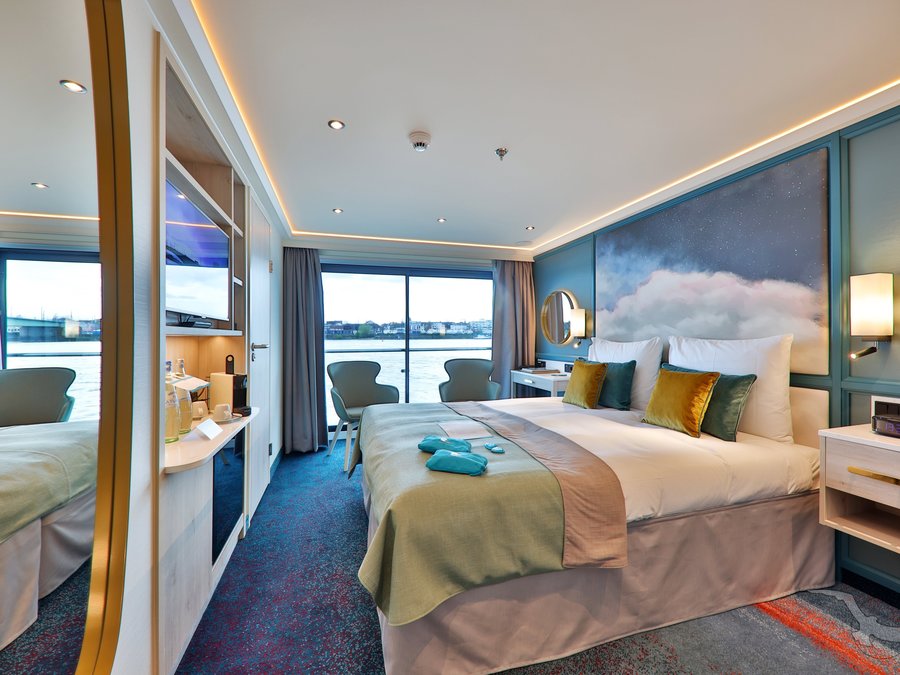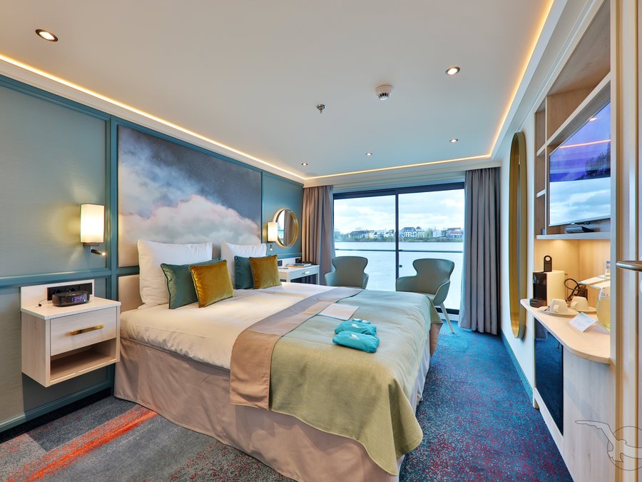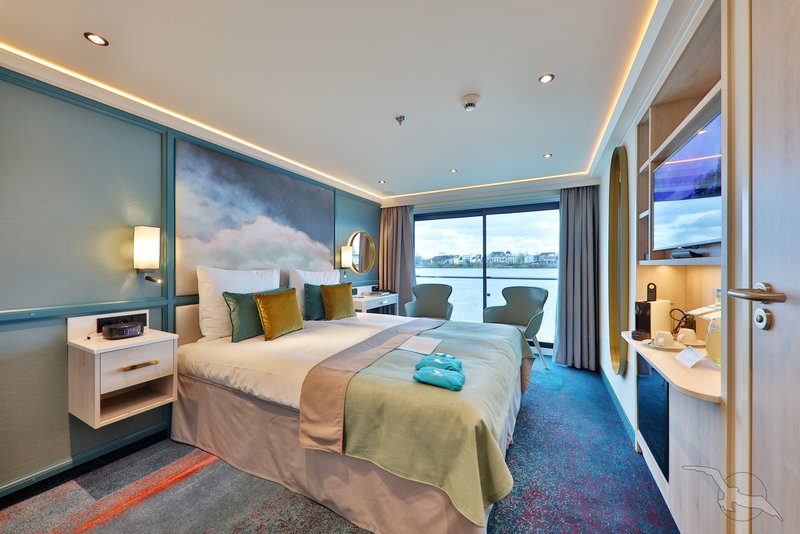 Alle Kabinen liegen außen und sind komfortabel und luxuriös eingerichtet und haben einen französischen Balkon. Die Betten lassen sich wahlweise als Doppel- oder Einzelbetten stellen.