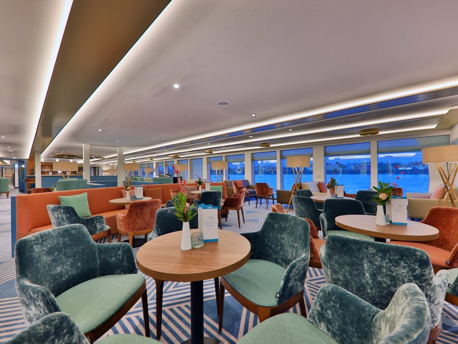 Geschmackvolles, warmes Ambiente und sportlich-elegante Atmosphäre. Panorama-Restaurant "Vier Jahreszeiten" (eine Tischzeit). Elegante Heckbar mit Spezialitätenrestaurant, Bibliothek, Sauna, Wäscheservice. Großflächiges Sonnendeck mit kleinem Pool, XL-Schachspiel, Liegestühle, Sitzgruppen und Schattenplätze und Sitzterrasse vorne inkl. Barbecue. WLAN (kostenpflichtig), je nach Fahrgebiet kann es ggf. zu Ausfällen/Störungen kommen.