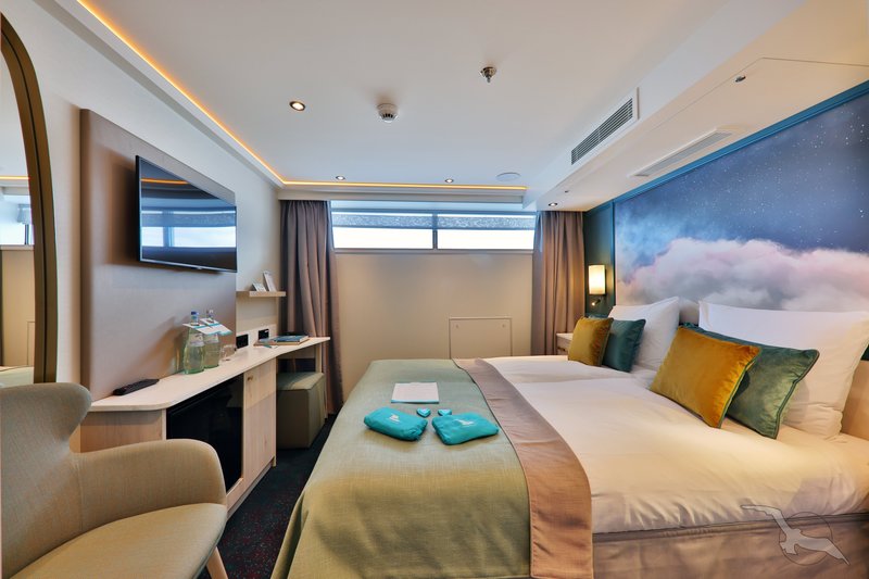 Alle Kabinen liegen außen und sind komfortabel und luxuriös eingerichtet mit kleinen Fenstern, die aus Sicherheitsgründen nicht zu öffnen sind.Die Betten lassen sich wahlweise als Doppel- oder Einzelbetten stellen Die Kabinen dieser Kategorie liegen im hinteren Bereich des Schiffes, bei fahrendem Schiff verstärkte Maschinengeräusche.
