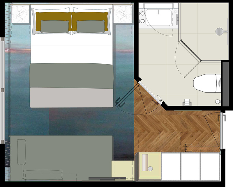 Ausstattung: Dusche/WC, Fön, individuell regulierbare Klimaanlage, SAT-TV (Flachbildschirm), Radio, Kaffeemaschine, Minibar, Safe, Telefon, Bordspannung 230 V Wechselstrom. Kabinengröße ca. 15,5 qm.