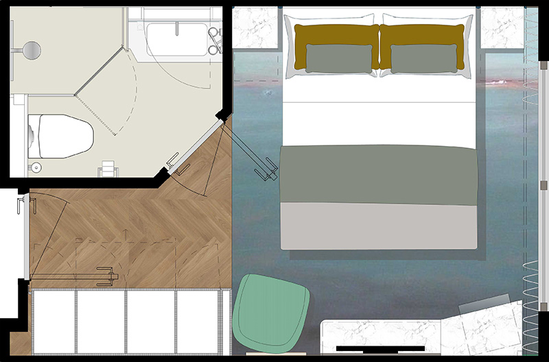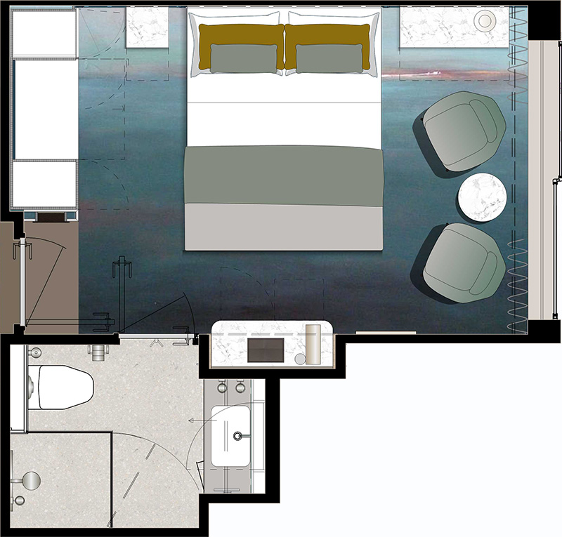Ausstattung: Dusche/WC, Föhn, individuell regulierbare Klimaanlage, SAT-TV, Radio, Kaffeemaschine, Minibar, Safe, Telefon, kleine Tageszeitung, Bordspannung 230 V Wechselstrom. Die Betten lassen sich wahlweise als Doppel- oder Einzelbetten stellen.