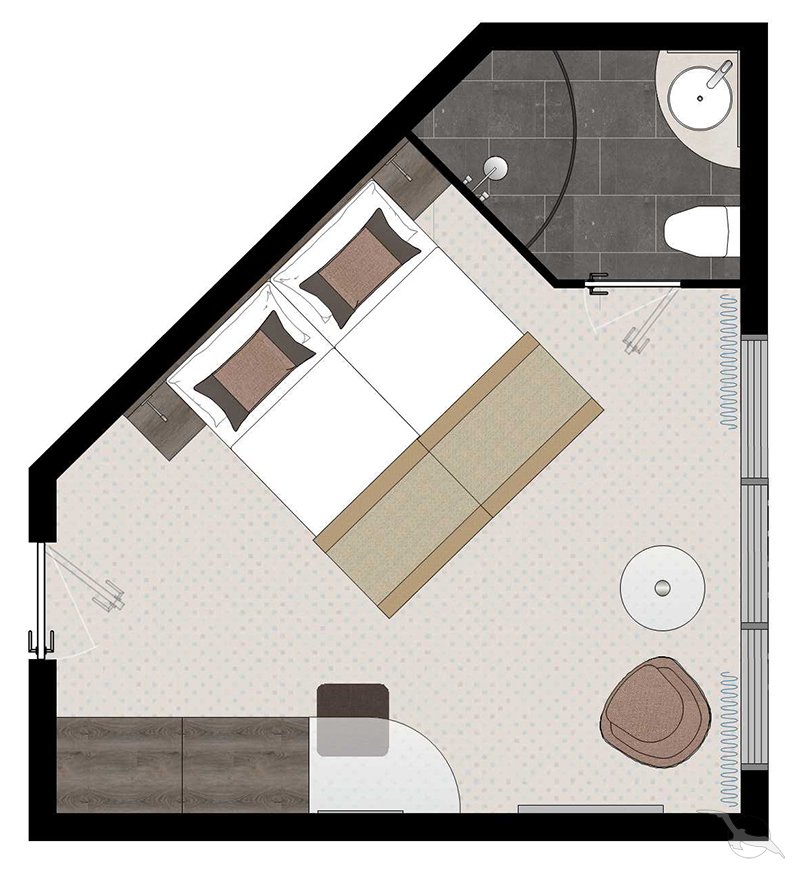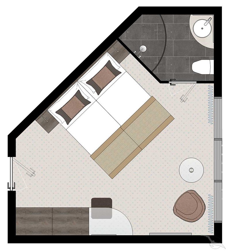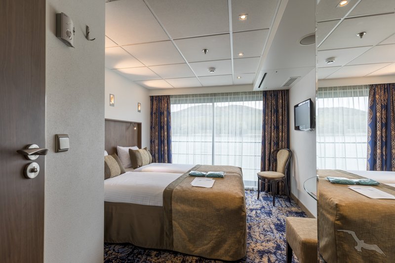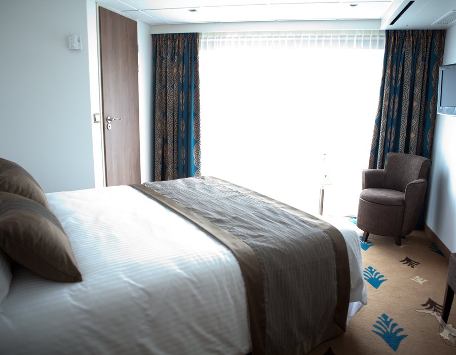 Alle Kabinen liegen außen, sind komfortabel und elegant eingerichtet mit französischem Balkon, raumhoher Fensterfront und Schiebetür. Die Betten lassen sich wahlweise als Doppel- oder Einzelbetten stellen.