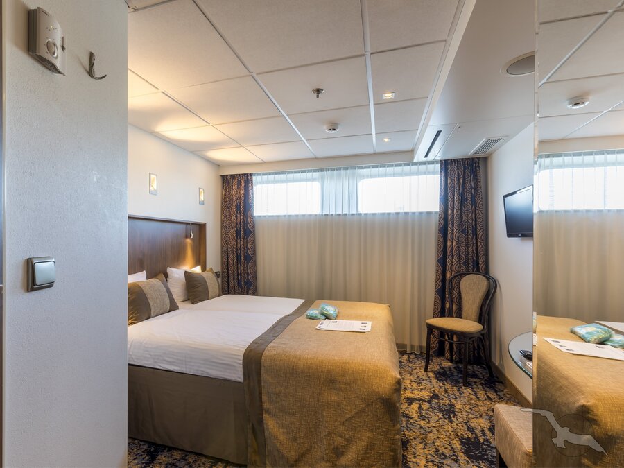 Alle Kabinen liegen außen, sind komfortabel und elegant eingerichtet mit kleinen Fenstern, die aus Sicherheitsgründen nicht zu öffnen sind. Die Betten lassen sich wahlweise als Doppel- oder Einzelbetten stellen. Lage der Kabinen im hinteren Bereich des Schiffes, bei fahrendem Schiff verstärkte Maschinengeräusche.