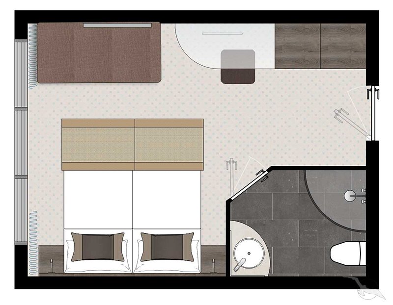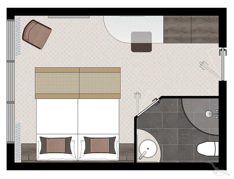Alle Kabinen liegen außen, sind komfortabel und elegant eingerichtet mit kleinen Fenstern, die aus Sicherheitsgründen nicht zu öffnen sind. Die Betten lassen sich wahlweise als Doppel- oder Einzelbetten stellen.