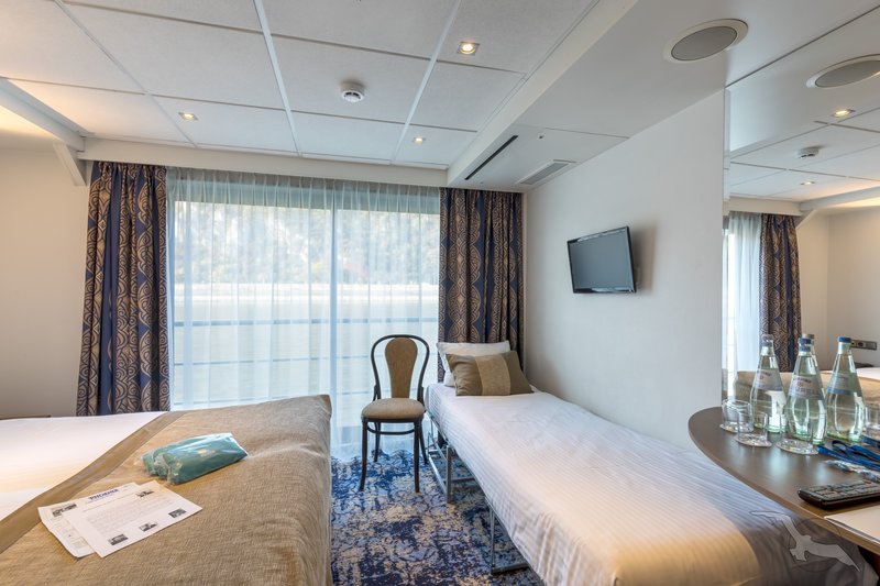 Alle Kabinen liegen außen, sind komfortabel und elegant eingerichtet mit französischem Balkon, raumhoher Fensterfront und Schiebetür. Diese Kabinen verfügen über zwei untere Betten und ein Zusatzbett.