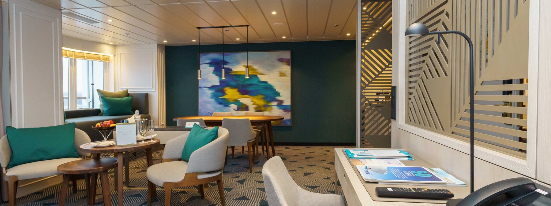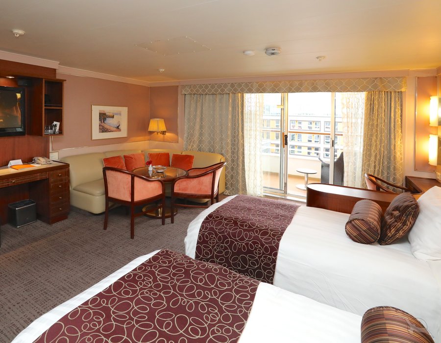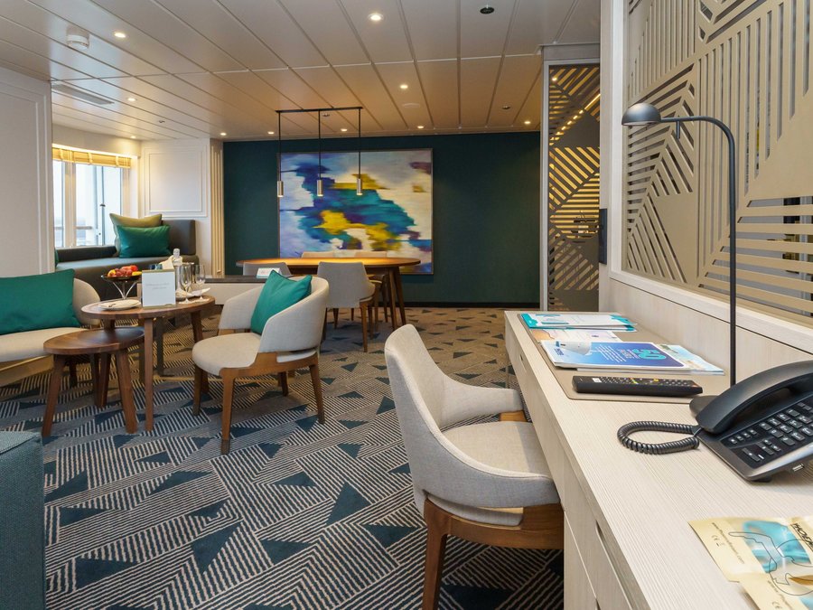 Die 2-Bett-Junior-Suiten mit Schiebetür zum Privat-Balkon sind elegant ausgestattet, mit 2 unteren Betten (auf Wunsch trennbar) und einem separaten Sofa (als zusätzliches Schlafsofa nutzbar). Die Kabinen verfügen über einen begehbaren Kleiderschrank, Tisch und zwei Stühle, Kommode mit mehreren Schubfächern, Kaffeemaschine inklusive Kapseln (kostenlos), DU/WC, Duschgel/Shampoo.