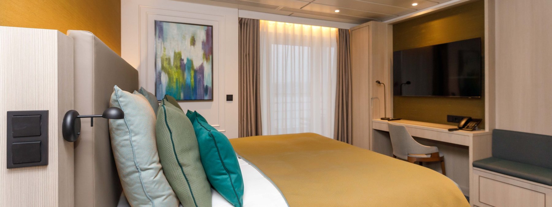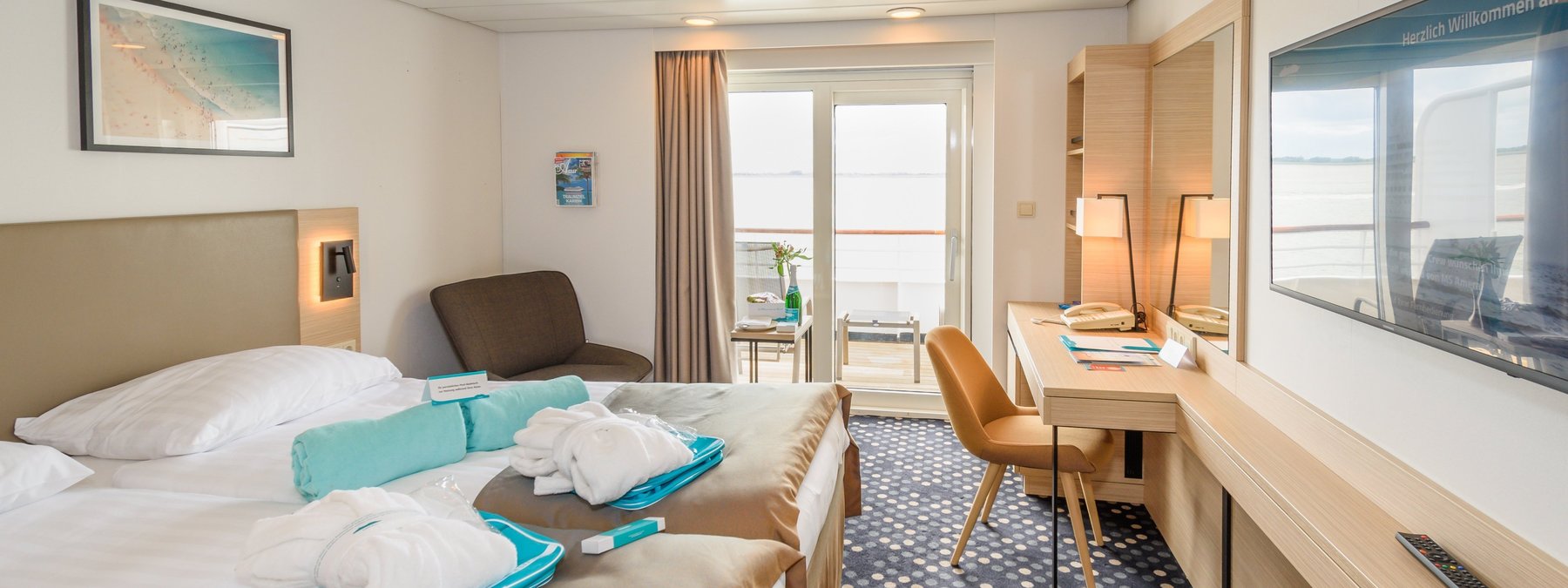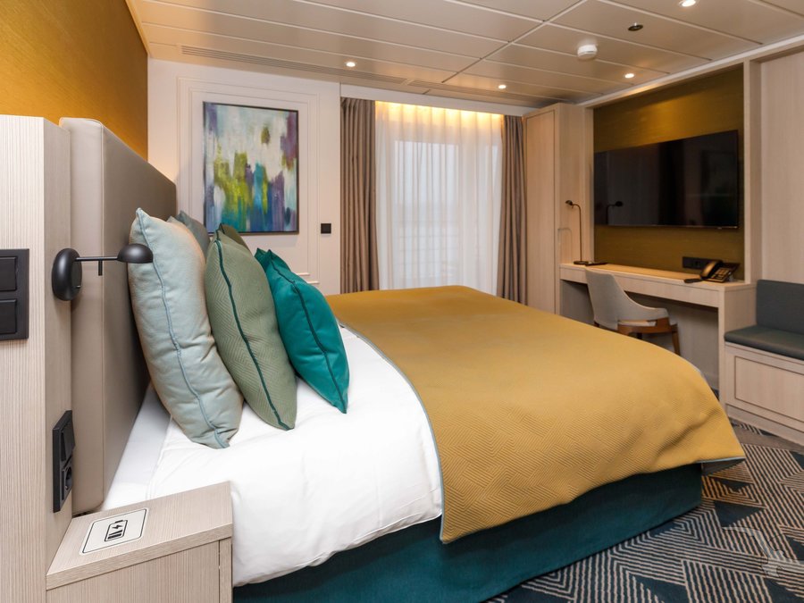 Die Kabinen verfügen über zwei Bullaugen oder ein Fenster (jeweils nicht zu öffnen) und 2 untere Betten. Zu der Ausstattung gehören ein begehbarer Kleiderschrank bzw. zwei große Schränke, Spiegelkommode mit mehreren Schubfächern und Stuhl, Sessel, Kaffeemaschine inklusive Kapseln (kostenlos), DU/WC, Duschgel/Shampoo. SAT-TV (Empfang abhängig vom Fahrgebiet), individuell regulierbare Klimaanlage, Telefon, Minibar, Safe, Fön.