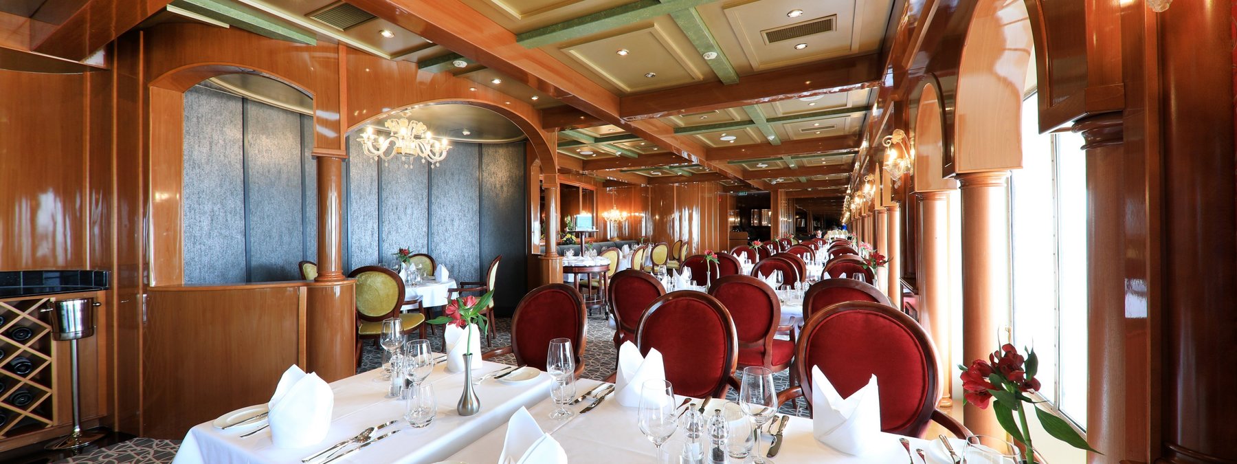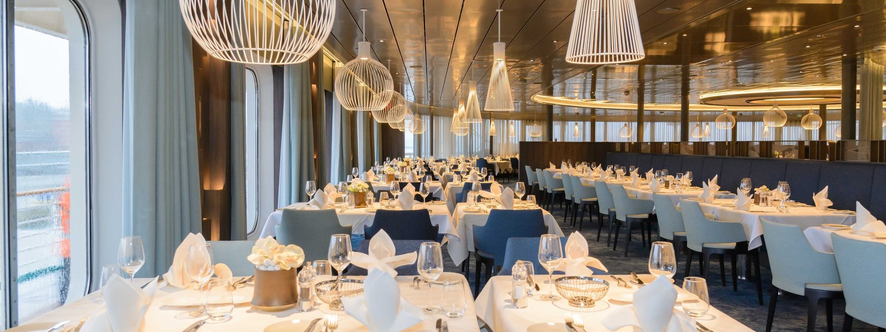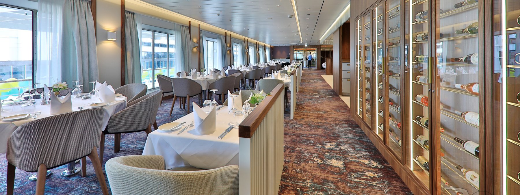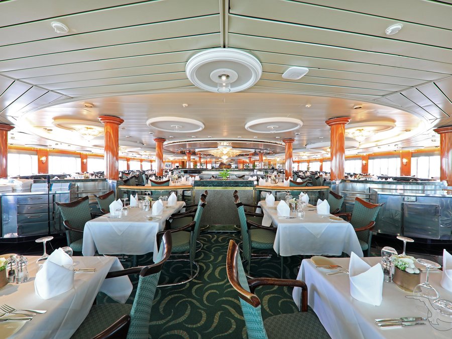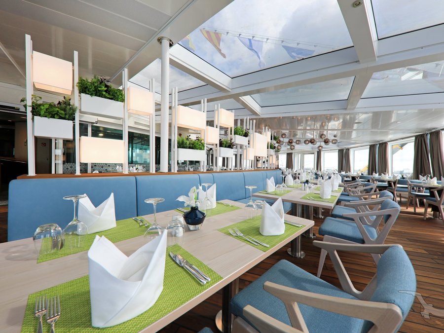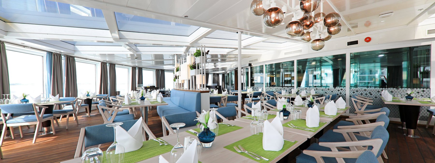 Zwei gleichwertige Restaurants »Ozean« und »Amera«. Weitere Plätze bietet das Lido-Buffet-Restaurant, so dass alle Gäste in einer Tischzeit Platz finden. Restaurant »Ozean«: Frühstück wird in Buffetform angeboten, Mittag- und Abendessen werden am Platz serviert. Restaurant »Amera«: Frühstück wird in Buffetform angeboten. Mittag- und Abendessen werden am Platz serviert. Lido-Restaurant: Alle Mahlzeiten in Buffetform. Darüber hinaus haben Sie die Möglichkeit, sich für einen besonderen Abend einen Tisch in "Pichler’s" Spezialitätenrestaurant zu reservieren (Reservierungen sind ausschließlich an Bord möglich, ohne Aufpreis). Auf MS Amera sind besonders zum Mittag- und Abendessen lange Öffnungszeiten eingeplant, damit Sie ganz nach Ihren Gewohnheiten früher oder später, bei freier Platzwahl, essen können.