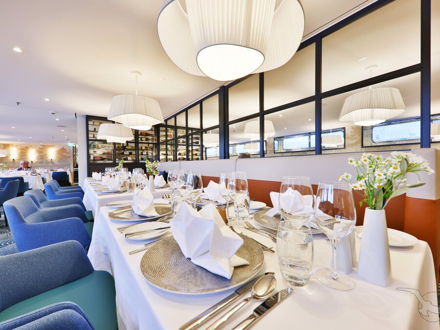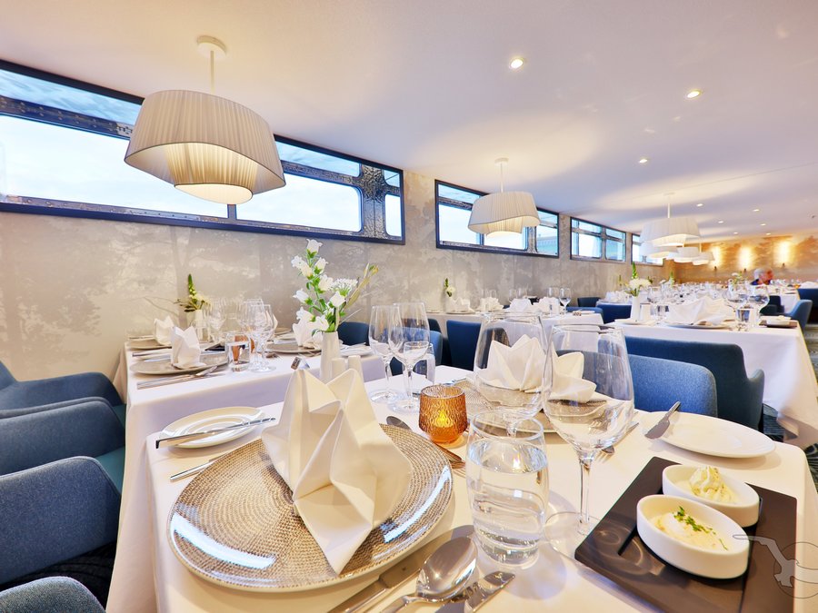 Kapitänsempfang und Kapitäns-Dinner mit festlichem Menü. Essen ohne eng gefasste Essenszeiten immer in einer Tischzeit! Auf Wunsch servieren wir Ihnen auch Gerichte für spezielle Diäten (Diabetiker, glutenfrei, laktosefrei etc.)