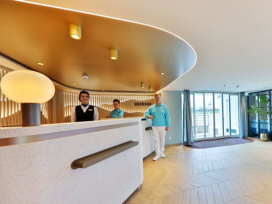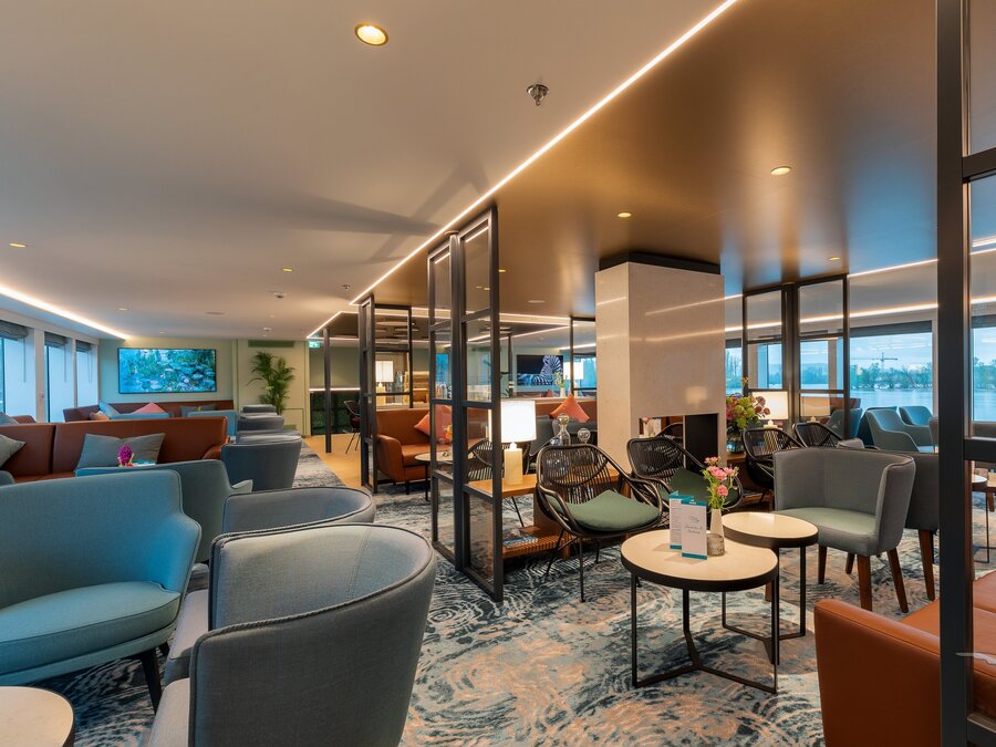 Die Kabinen, überwiegend mit französischem Balkon, laden zum Entspannen und Erholen ein. Die schicken Räumlichkeiten sind lichtdurchflutet, stilvoll, aber nicht überladen eingerichtet und bieten ein angenehmes Ambiente. MS Amina verfügt über vier Passagierdecks, 91 geräumige Kabinen mit französischem Balkon, große und helle Räumlichkeiten mit stilvoll eingerichteter Panorama-Lounge mit Bar, Lobby mit Rezeption.