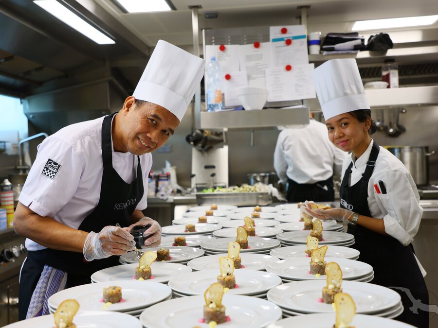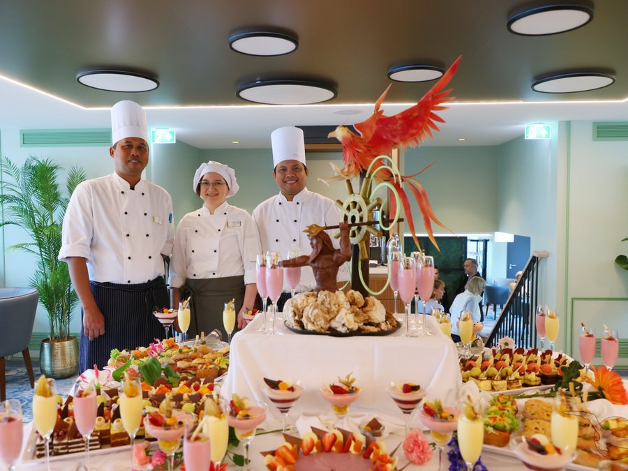 Zahlreiche Mitarbeiter in Küche und Restaurant sorgen täglich für Ihr leibliches Wohl an Bord. Genussvolle Menüs durch fest eingespielte Küchenteams werden für Sie zubereitet. "Essen, was das Herz begehrt" - Zahlreiche Mahlzeiten von früh bis spät - einschließlich Nachmittags-Kaffeezeit.