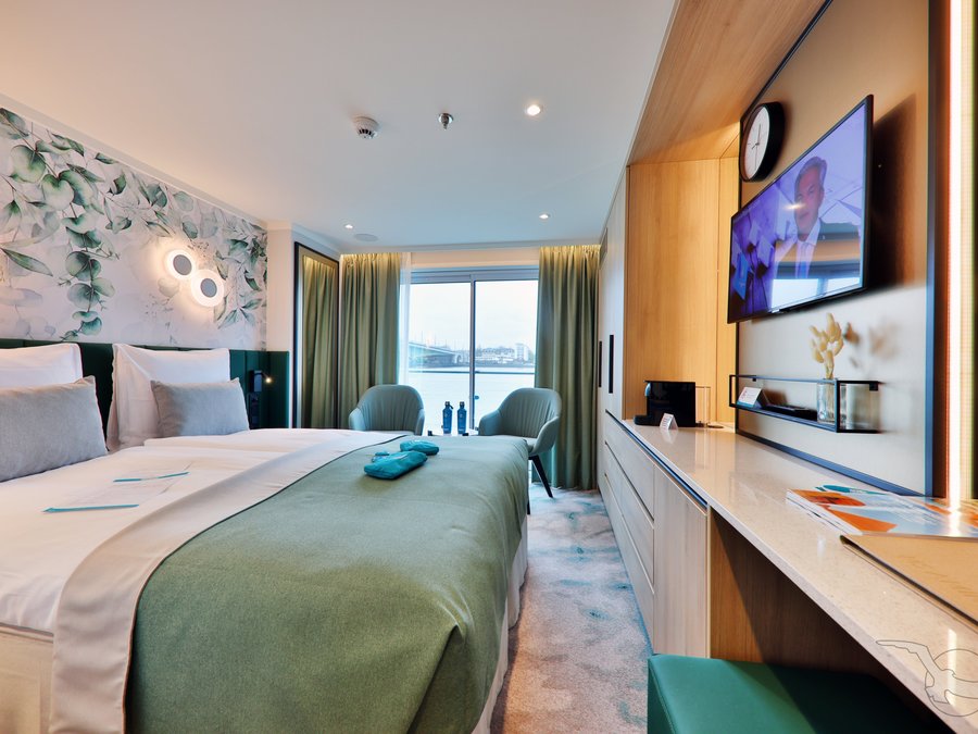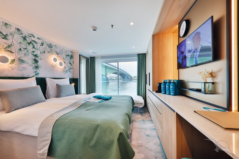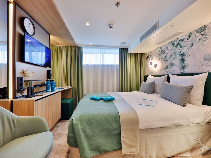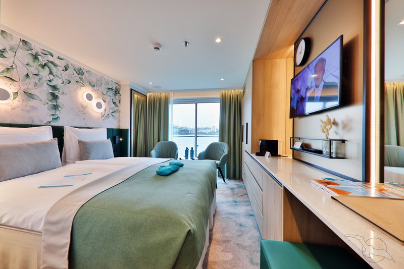 Alle Kabinen liegen außen, sind komfortabel sowie luxuriös eingerichtet und haben einen französischen Balkon. Die Betten lassen sich wahlweise als Doppel- oder Einzelbetten stellen.