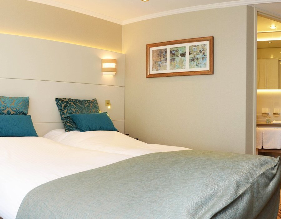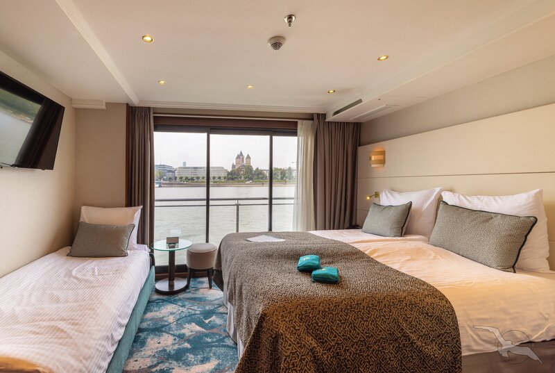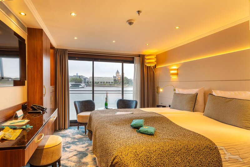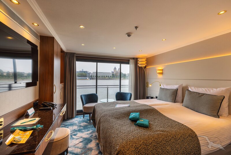 Alle Kabinen liegen außen und sind komfortabel und luxuriös eingerichtet und haben einen französischen Balkon. Die Betten lassen sich wahlweise als Doppel- oder Einzelbetten stellen