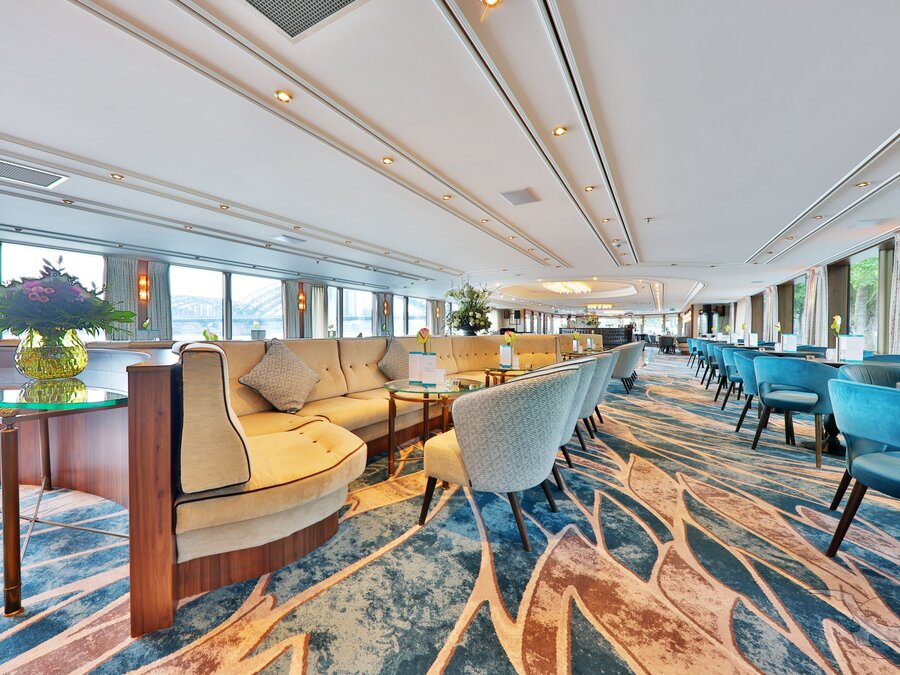 - Vollpension an Bord (beginnend mit dem Abendessen des ersten Tages, endend mit dem Frühstück am letzten Tag): Frühstücksbuffet, mehrgängiges Mittag- und Abendessen, Nachmittagskaffee/Tee, Mitternachtssnack. Gehobene europäische Küche.