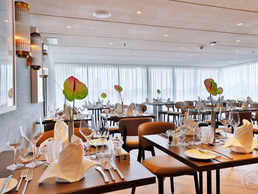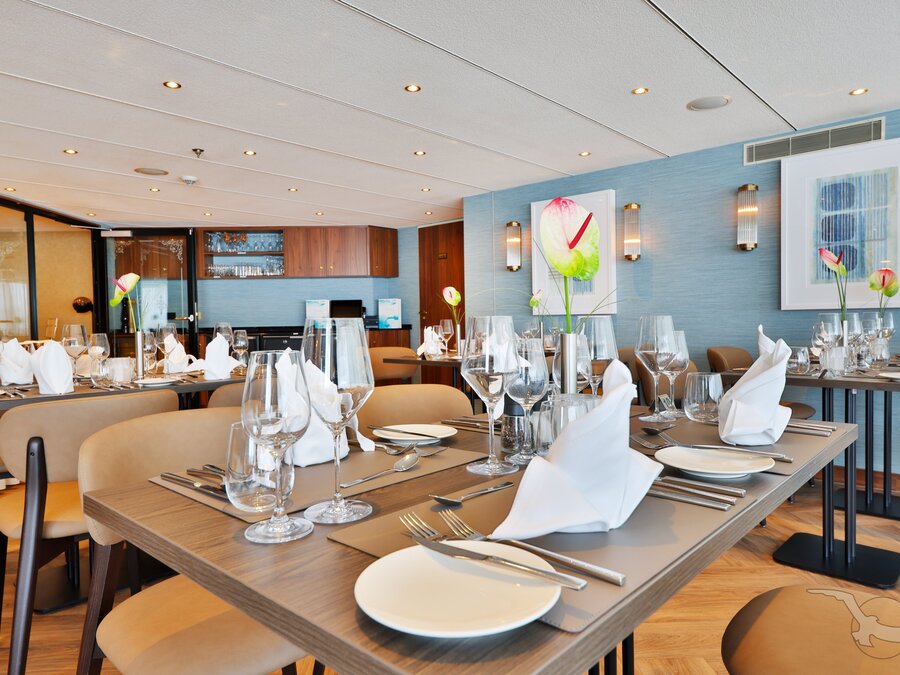 MS Anesha verfügt entsprechend ihrer Kategorie über ein komfortables und zugleich gemütliches Restaurant. Große Fensterfronten für tolle Ausblicke auch während der Mahlzeiten Ein aufmerksames Restaurant- und Küchenteam kümmert sich à la carte oder in Buffetform um Ihr kulinarisches Wohlergehen. Neben der festen Tischplatzwahl bieten wir offene lange Tischzeiten an.