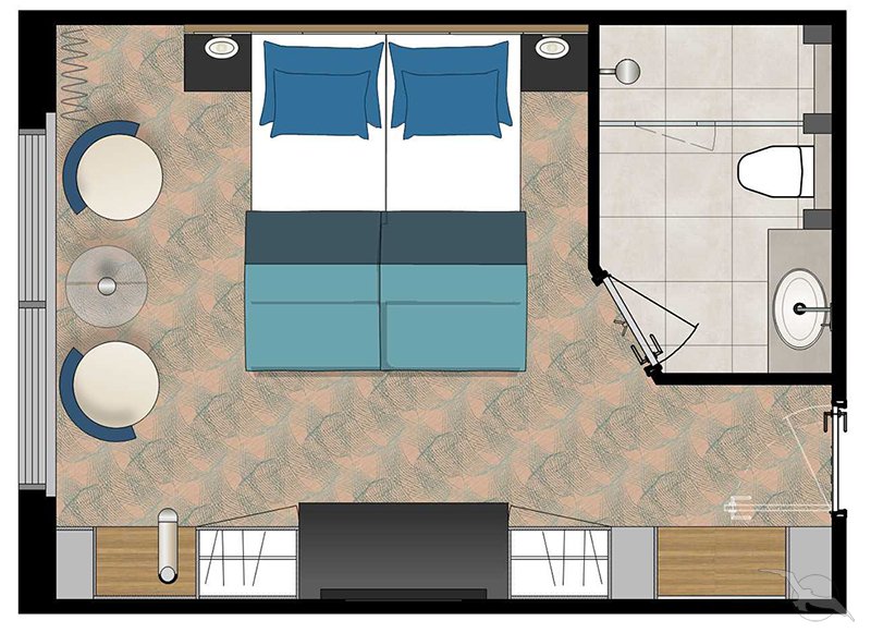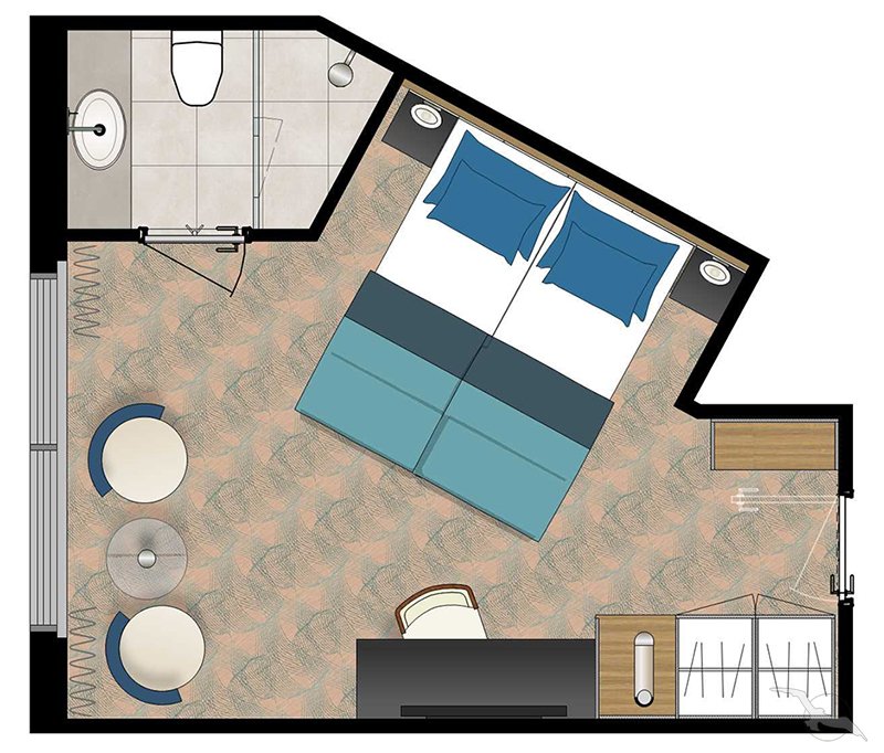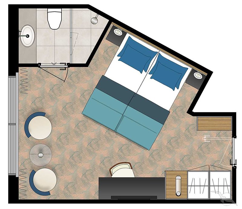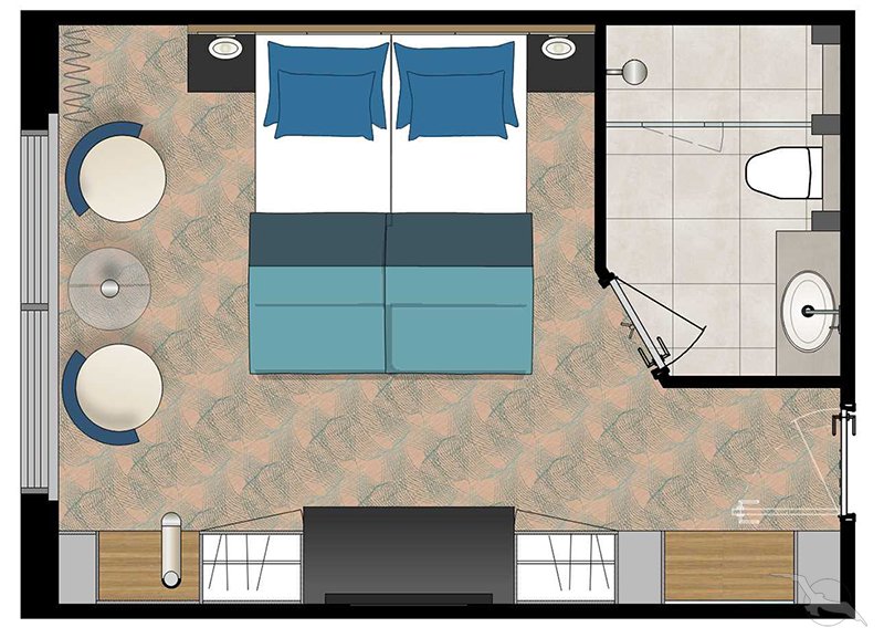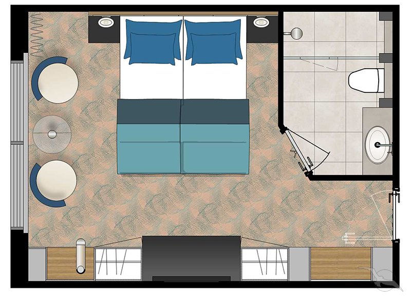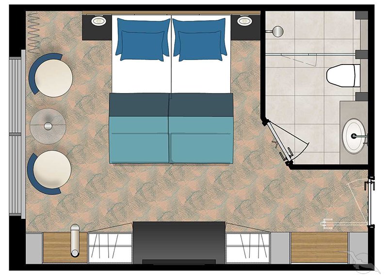 Ausstattung: Dusche/WC, Fön, individuell regulierbare Klimaanlage, SAT-TV (Flachbirldschirm), Radio, Minibar, Kaffeemaschine, Safe, telefon, Bodspannung 230 V Wechselstrom. Kabinengröße ca. 18,5 qm.