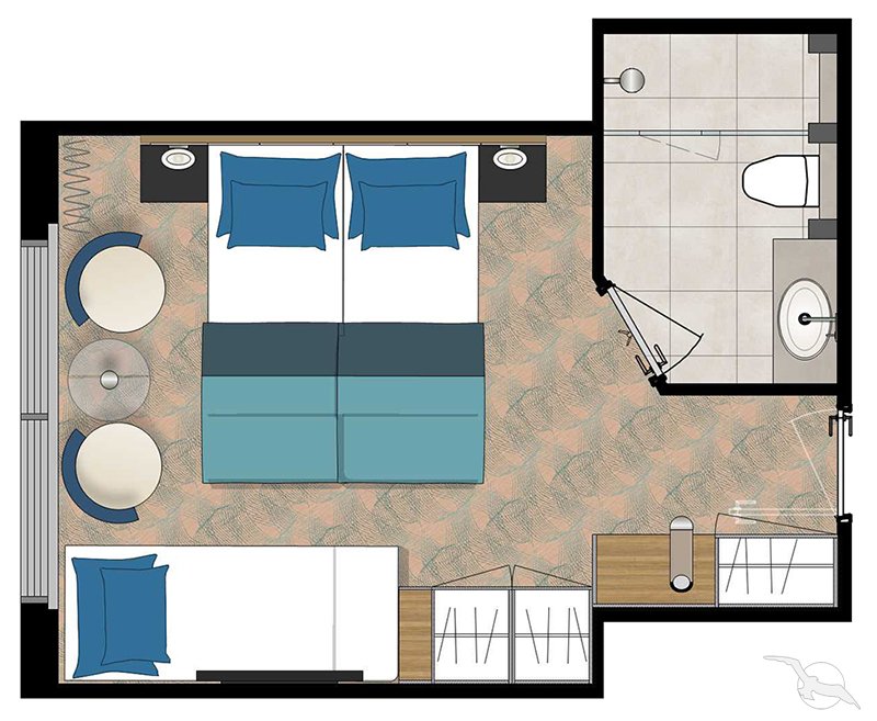 Ausstattung: Dusche/WC, Föhn, individuell regulierbare Klimaanlage, SAT-TV, Radio, Minibar, Safe, Telefon, kleine Tageszeitung. Die Bordspannung liegt bei 230 V Wechselstrom. Die Betten lassen sich wahlweise als Doppel- oder Einzelbetten stellen.