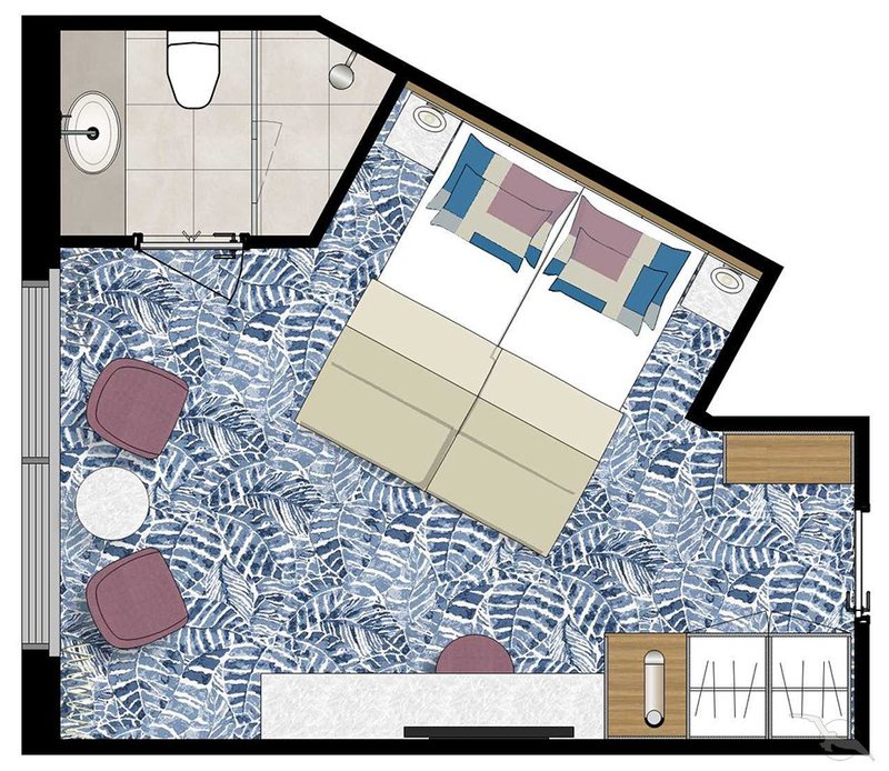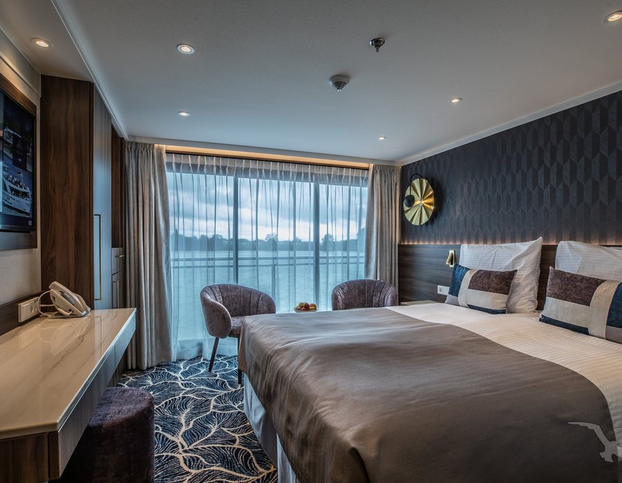 Alle Kabinen liegen außen und sind komfortabel und luxuriös eingerichtet und haben einen französischen Balkon. Die Betten lassen sich wahlweise als Doppel- oder Einzelbetten stellen.