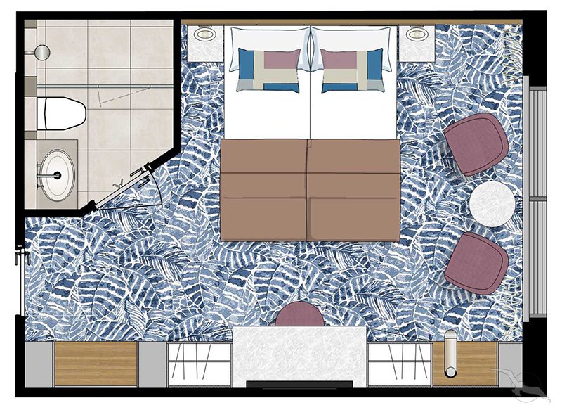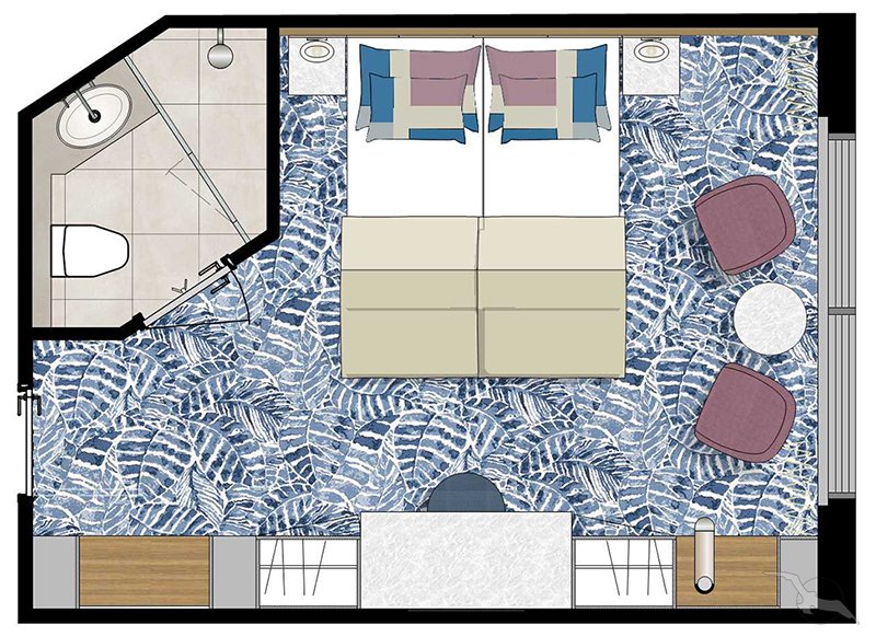 Ausstattung: Dusche/WC, Fön, individuell regulierbare Klimaanlage, SAT-TV (Flachbildschirm), Radio, Minibar, Kaffeemaschine, Safe, Telefon. Die Bordspannung liegt bei 230 V Wechselstrom. Die Betten lassen sich wahlweise als Doppel- oder Einzelbetten stellen. Kabinengröße ca. 18,5 qm.