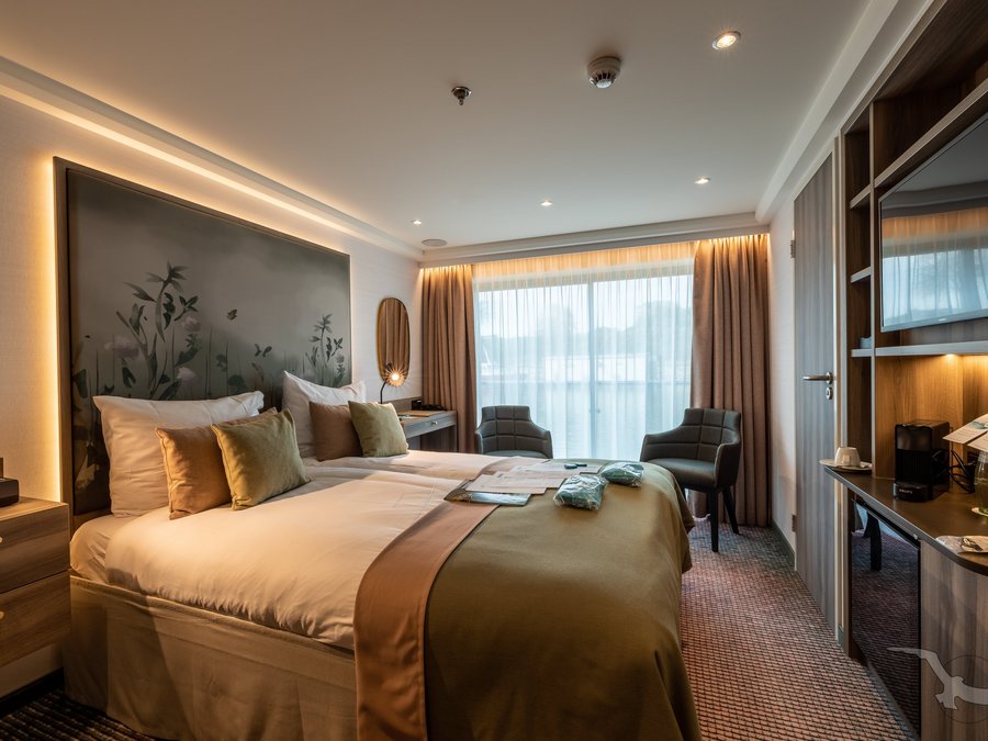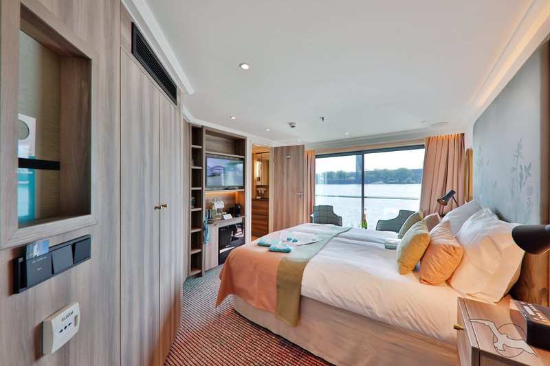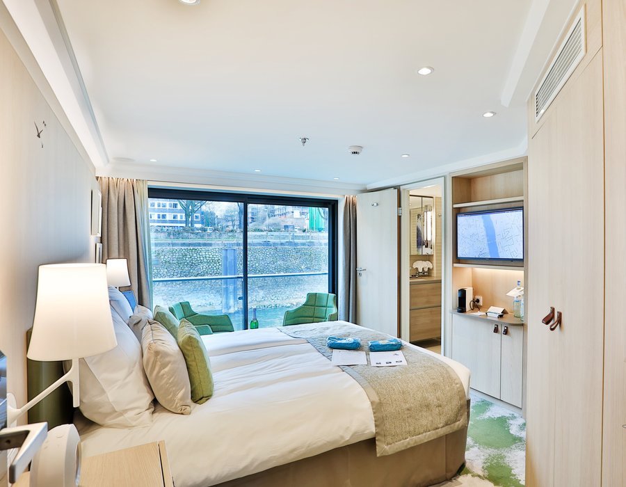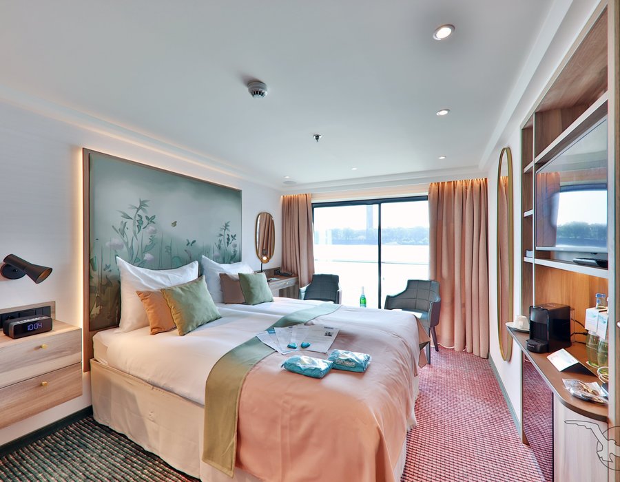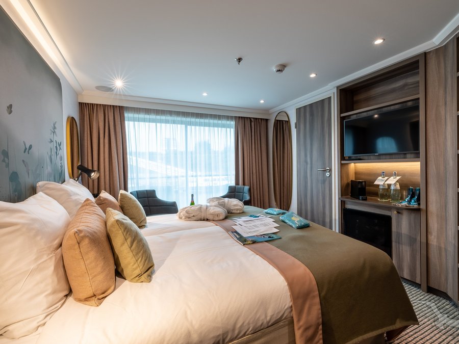 Alle Kabinen liegen außen und sind komfortabel und luxuriös eingerichtet und haben einen französischen Balkon. Die Betten lassen sich wahlweise als Doppel- oder Einzelbetten stellen.
