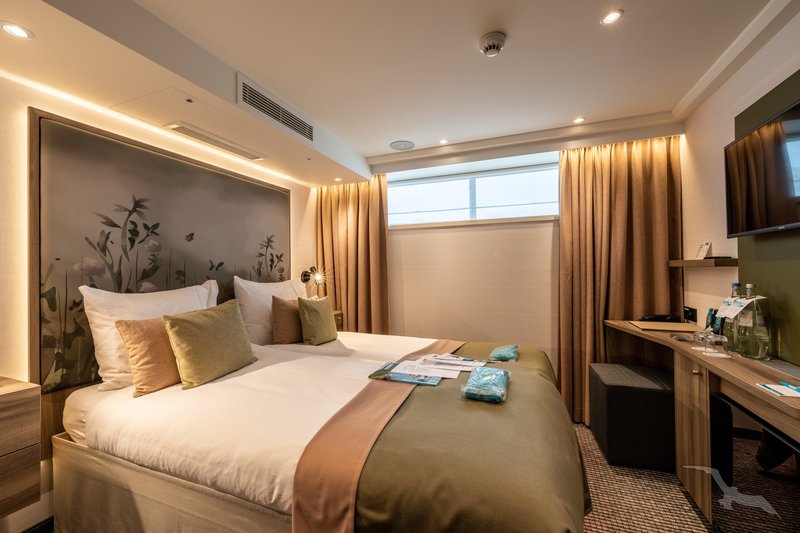 Ausstattung: Dusche/WC, Föhn, individuell regulierbare Klimaanlage, SAT-TV, Radio, Kaffeemaschine, Minibar, Safe, Telefon, kleine Tageszeitung, Bordspannung 230 V Wechselstrom. Die Betten lassen sich wahlweise als Doppel- oder Einzelbetten stellen.