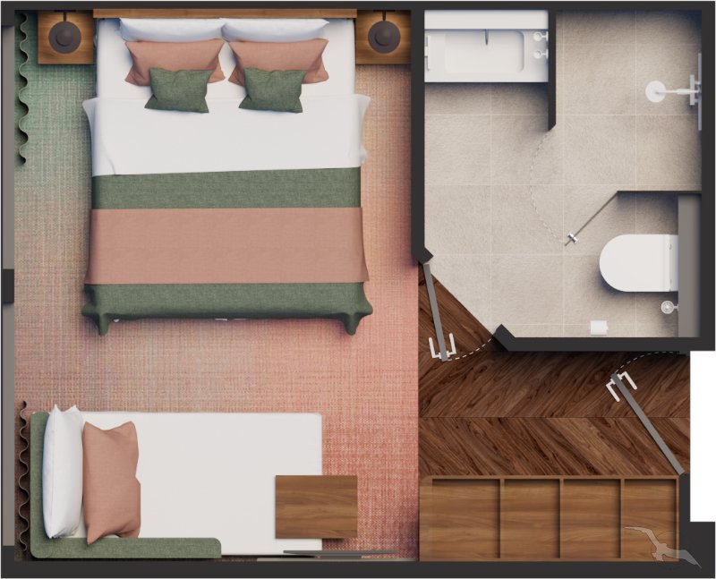 Ausstattung: Dusche/WC, Fön, individuell regulierbare Klimaanlage, SAT-TV (Flachbildschirm), Radio, Kaffeemaschine, Minibar, Safe, Telefon, Bordspannung 230 V Wechselstrom. Kabinengröße ca. 15,5 qm.