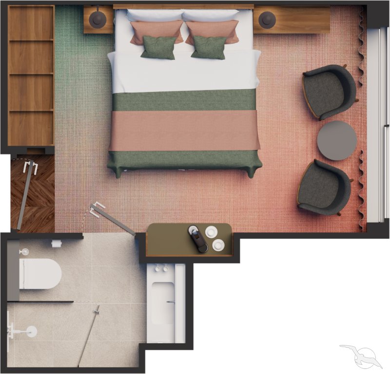 Ausstattung: Dusche/WC, Fön, individuell regulierbare Klimaanlage, SAT-TV (Flachbildschirm), Radio, Kaffeemaschine, Minibar, Safe, Telefon, Bordspannung 230 V Wechselstrom.