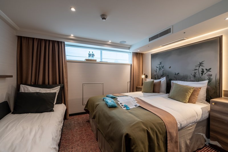 Alle Kabinen liegen außen und sind komfortabel und luxuriös eingerichtet mit kleinen Fenstern, die aus Sicherheitsgründen nicht zu öffnen sind. Die Betten lassen sich wahlweise als Doppel- oder Einzelbetten stellen.