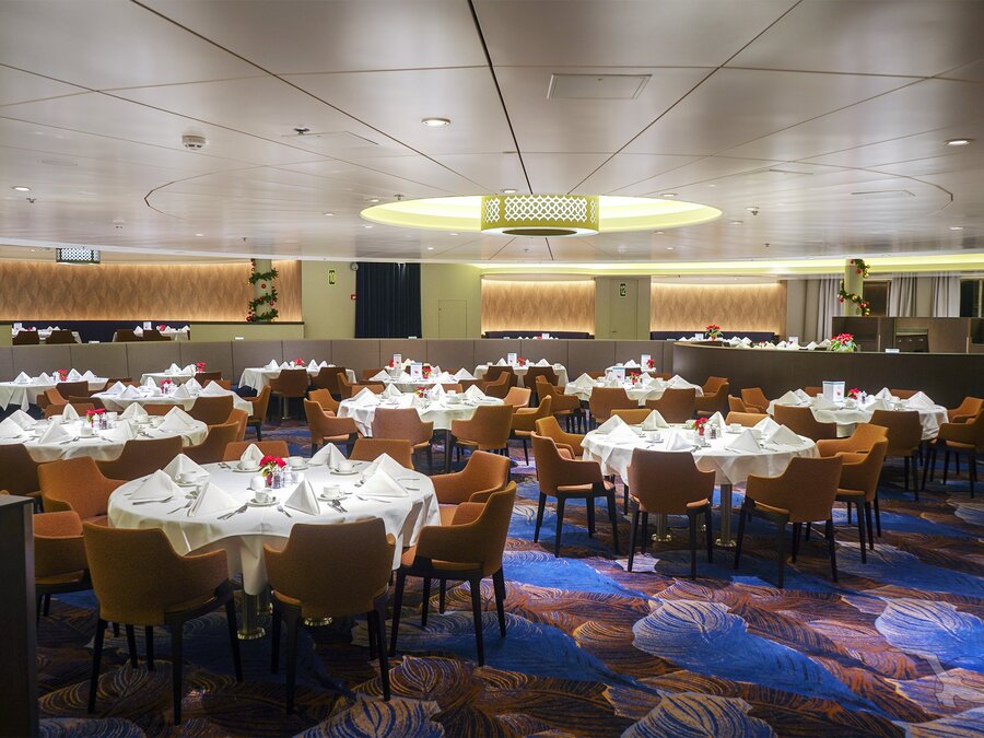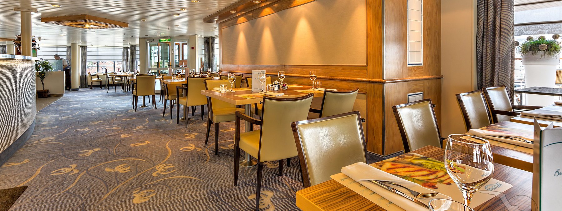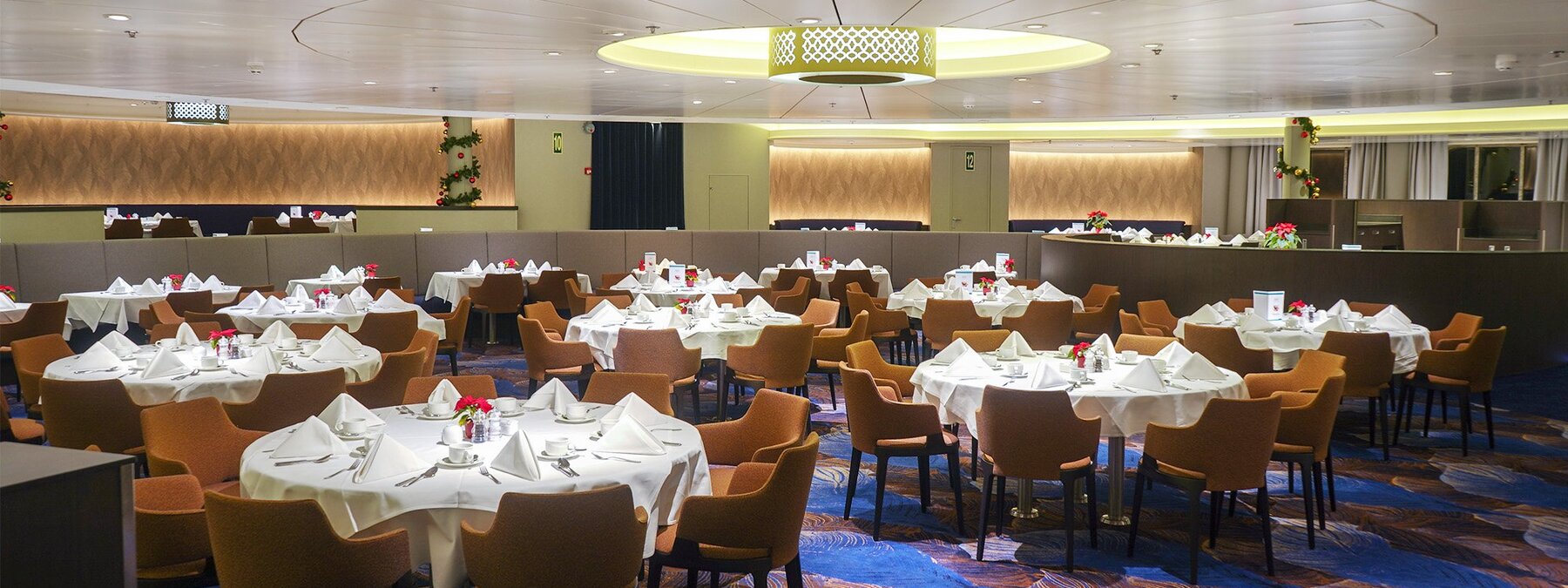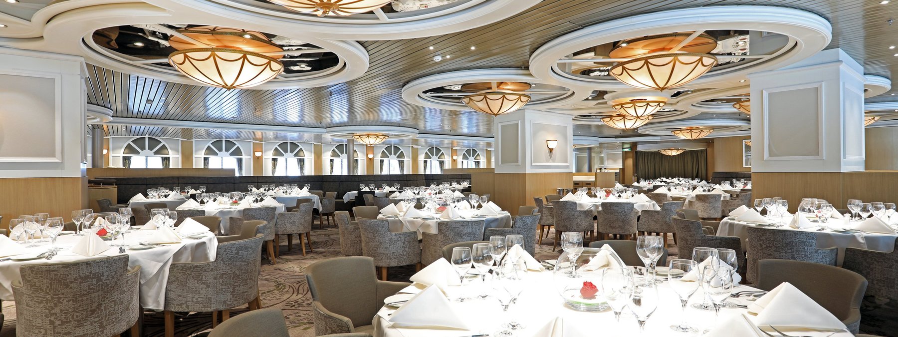 An Bord lässt es sich nach Herzenslust schlemmen. Zwei gleichwertige Restaurants mit großen Panoramafenstern stehen zur Auswahl, um sich bei freier Platzwahl während langer Öffnungszeiten ganz nach Wahl, früher oder später (inklusive Saft des Tages und Tischwein zum Mittag- und Abendessen) kulinarisch verwöhnen zu lassen. Das Lido Buffet-Restaurant mit Frühstücks- und Mittagsbuffet bietet auch abends mit Buffets eine weitere Option für all diejenigen, die es zwanglos mögen. Bei gutem Wetter können auch die Außenplätze auf der Sonnenterrasse oder im Außenpoolbereich genutzt werden. Darüber hinaus haben Sie die Möglichkeit, sich für einen besonderen Abend einen Tisch in *Pichler's* Spezialitätenrestaurant zu reservieren. Neben den Hauptmahlzeiten gibt es ein Frühaufsteher-Frühstück, die 11:00 Uhr-Bouillon, Kaffee und Kuchen sowie den traditionellen Mitternachtssnack. Selbstverständlich darf auch das festliche Captains Dinner nicht fehlen.