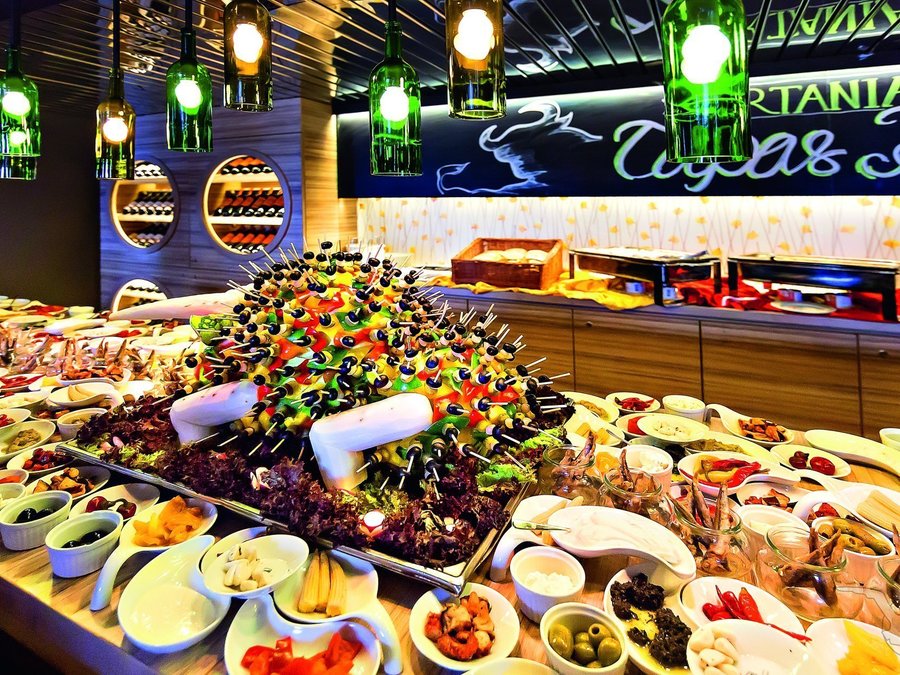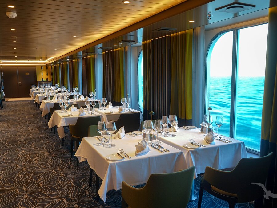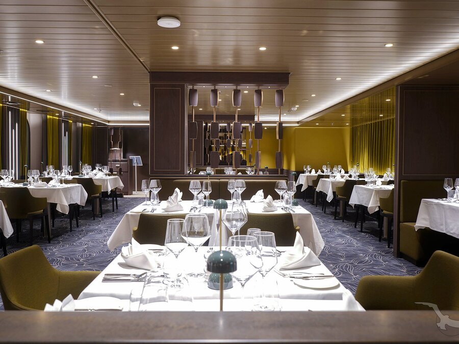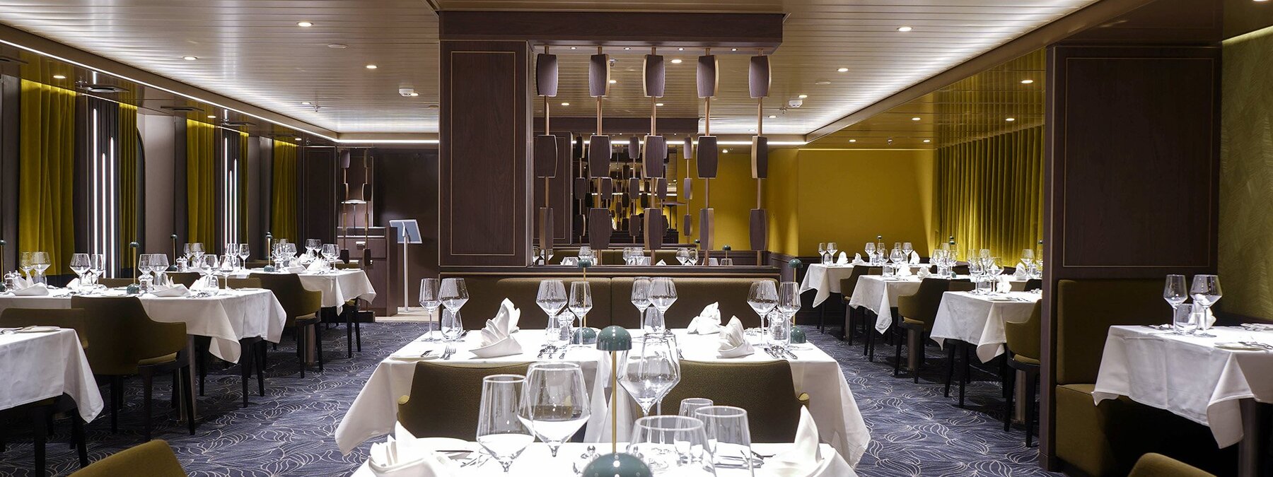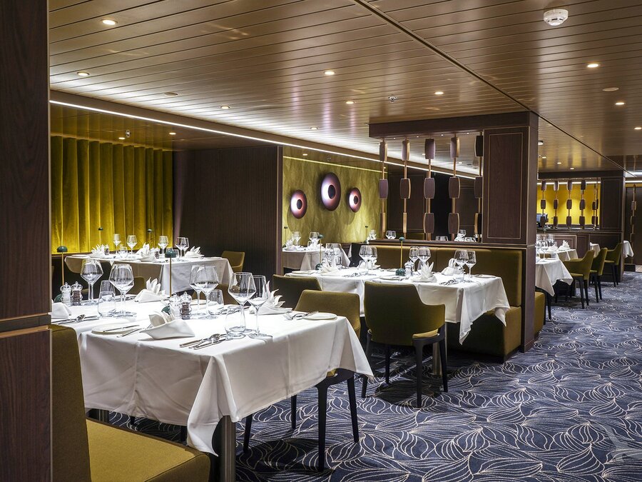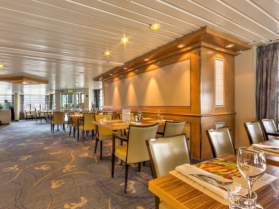 An Bord lässt es sich nach Herzenslust schlemmen. Zwei gleichwertige Restaurants mit großen Panoramafenstern stehen zur Auswahl, um sich bei freier Platzwahl während langer Öffnungszeiten ganz nach Wahl, früher oder später (inklusive Saft des Tages und Tischwein zum Mittag- und Abendessen) kulinarisch verwöhnen zu lassen. Das Lido Buffet-Restaurant mit Frühstücks- und Mittagsbuffet bietet auch abends mit Buffets eine weitere Option für all diejenigen, die es zwanglos mögen. Bei gutem Wetter können auch die Außenplätze auf der Sonnenterrasse oder im Außenpoolbereich genutzt werden. Darüber hinaus haben Sie die Möglichkeit, sich für einen besonderen Abend einen Tisch in *Pichler's* Spezialitätenrestaurant zu reservieren. Neben den Hauptmahlzeiten gibt es ein Frühaufsteher-Frühstück, die 11:00 Uhr-Bouillon, Kaffee und Kuchen sowie den traditionellen Mitternachtssnack. Selbstverständlich darf auch das festliche Captains Dinner nicht fehlen.