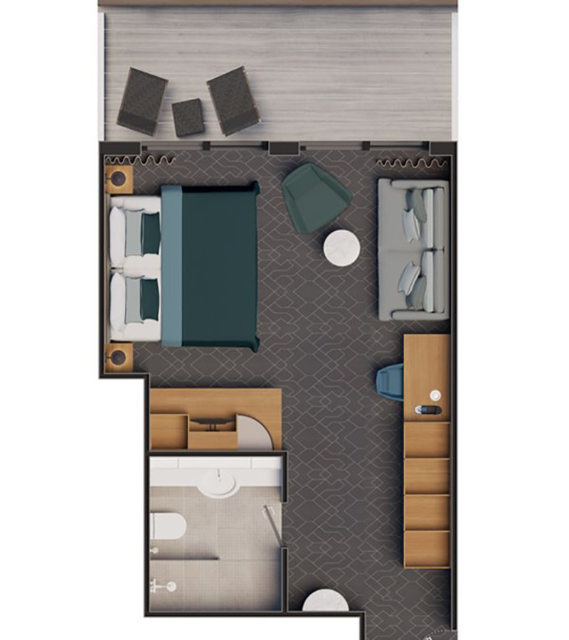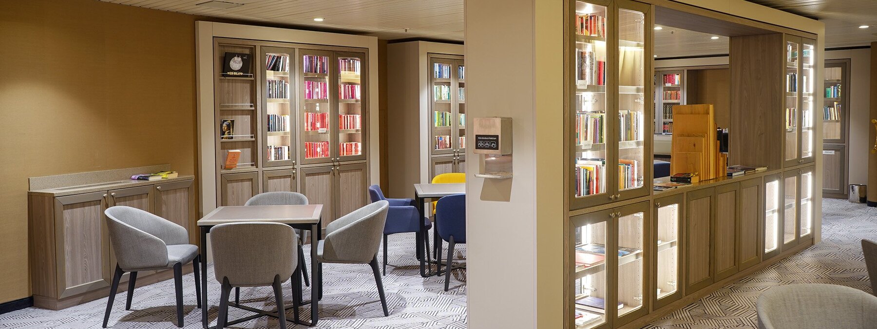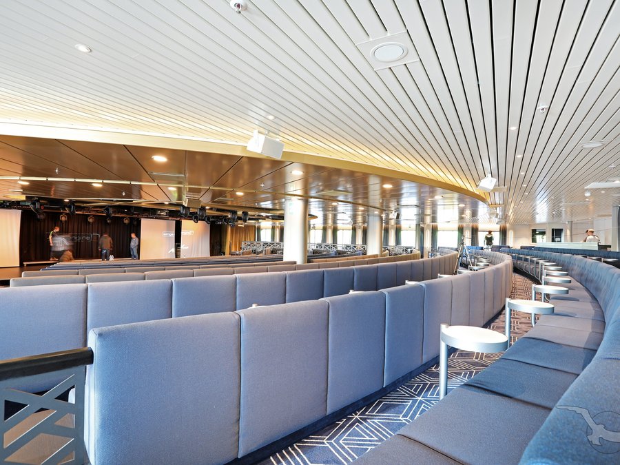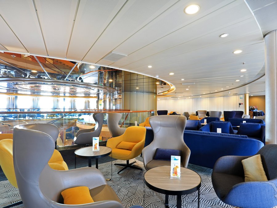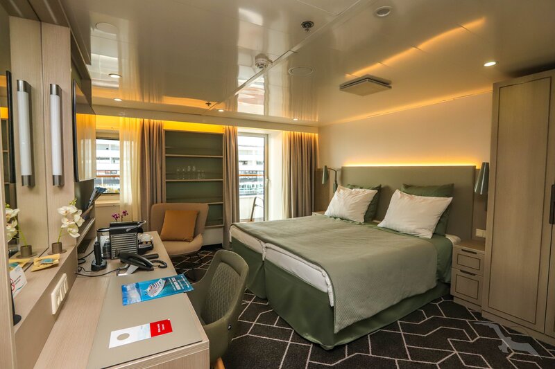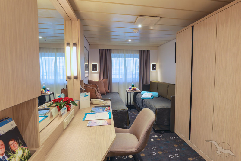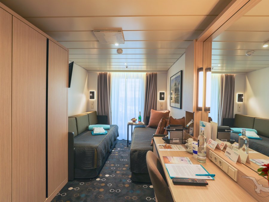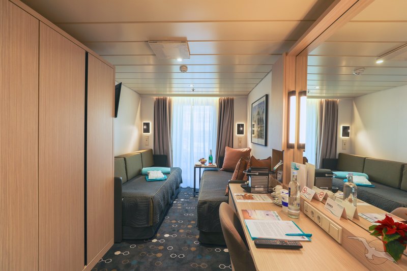 Es gibt 2 großräumige Doppelschränke, Sofa mit kleinem Tisch, Spiegelkommode mit Stuhl und mehreren Schubfächern, Wohnwand mit zusätzlichen Schubfächern, Dusche/WC, Duschgel/Shampoo, Bademantel, Fön, SAT-TV (Empfang abhängig vom Fahrgebiet), individuell regulierbare Klimaanlage, Bluetooth-Musikbox, Telefon, Minibar, Kaffeemaschine (inklusive Kapseln), Safe, (WLAN nicht inkl., Empfang abhängig vom Fahrgebiet).