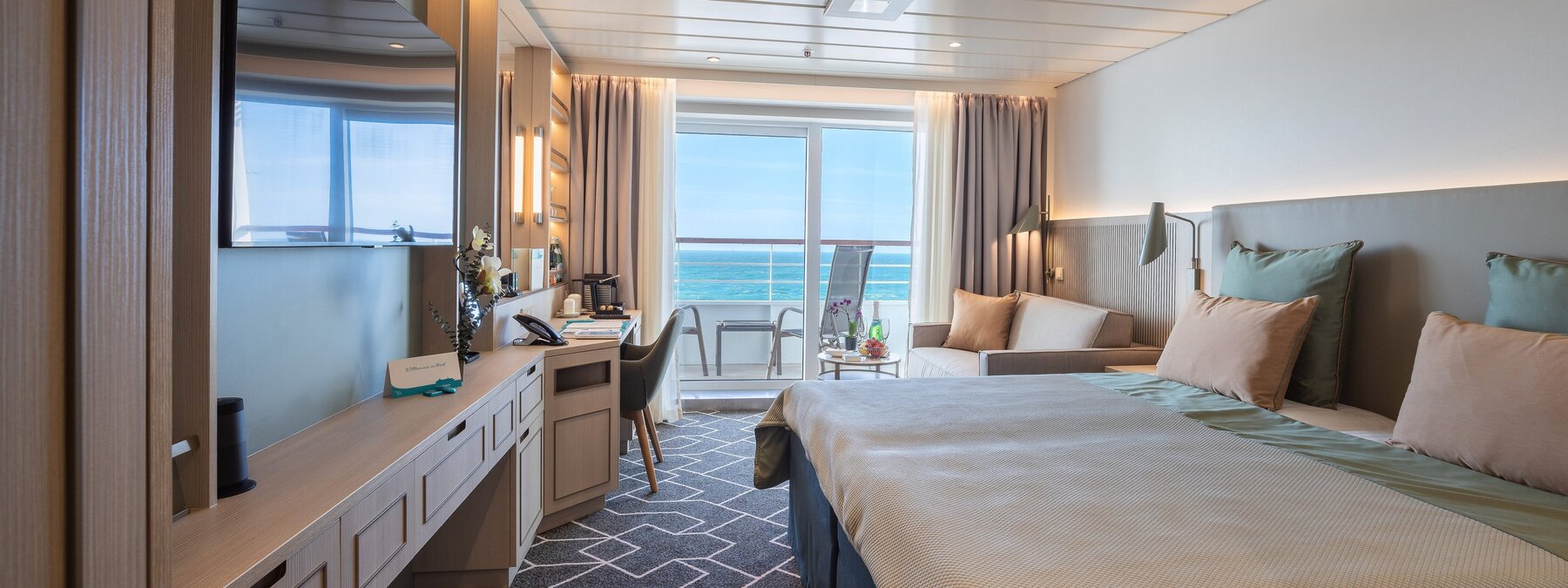 Diese 2-Bett-Superior-Kabinen zur Alleinbenutzung mit Schiebetür zum Privat-Balkon liegen außen auf dem Orion-/ Apollo- und Jupiter-Deck.