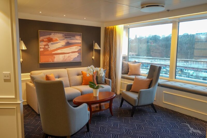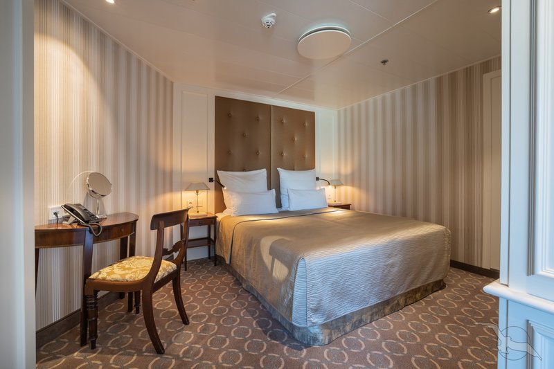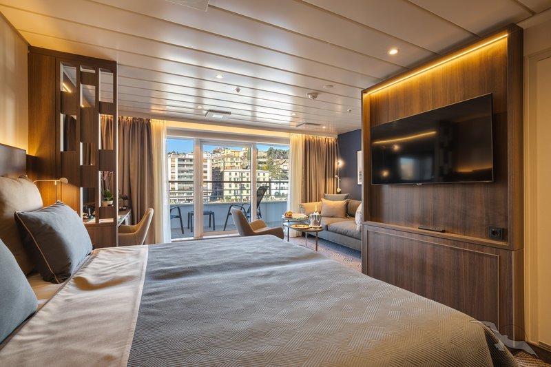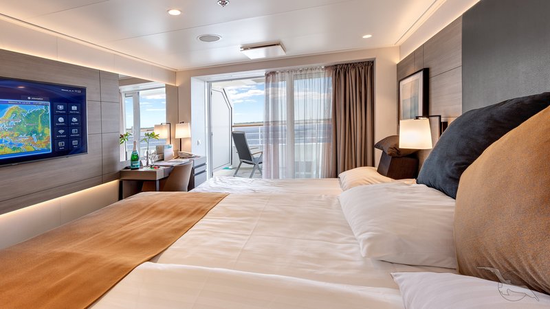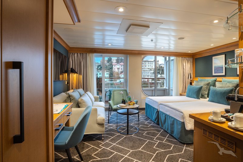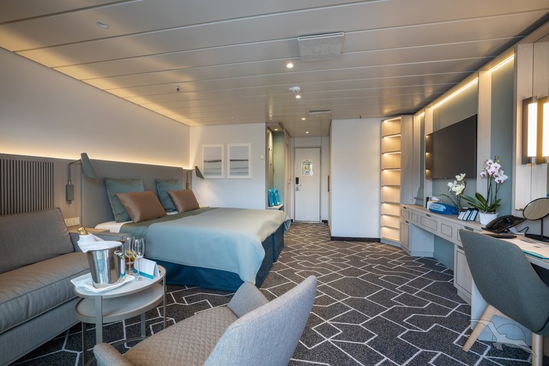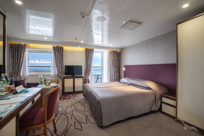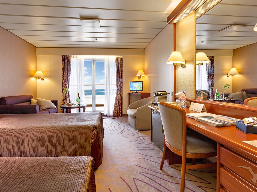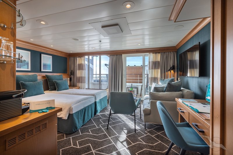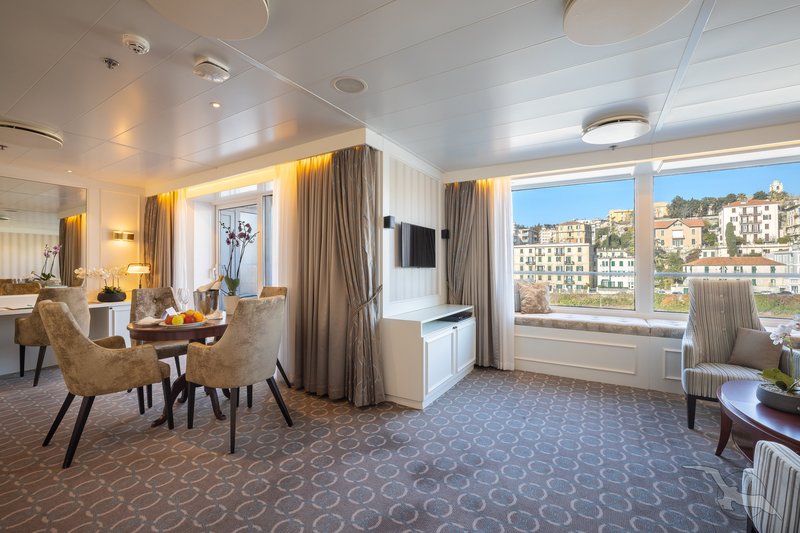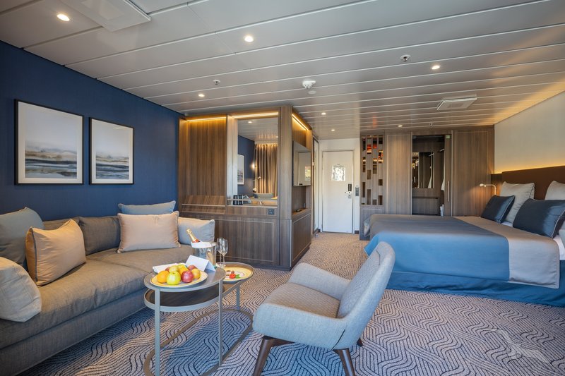Im Wohnraum befindet sich zusätzlich zu dem Schlafsofa ein Couchtisch und 2 Sessel, ein Esstisch mit 4 Stühlen, Schreibtisch mit großem Spiegel und Stauflächen, TV-Kommode mit DVD-Player und Stereoanlage, individuell regulierbare Klimaanlage, Safe, Kaffeemaschine inklusive Kapseln (kostenlos), Minibar mit Getränkeauswahl (kostenlos) und 3 GB Internetzugang frei (Erneuerung alle 14 Tage; Empfang abhängig vom Fahrgebiet) und 2 hochwertige Ferngläser zur Benutzung an Bord. Der Schlafbereich verfügt über ein großes Doppelbett (nicht trennbar), Schminktisch, 2 begehbare Kleiderschränke und TV (Empfang abhängig vom Fahrgebiet), Bademantel und Slipper. Das große Badezimmer ist mit 2 Waschbecken, großzügiger Dusche und Jacuzzi ausgestattet, Duschgel/Shampoo, ein spezielles Kosmetik-Set und Fön. WC und Bidet mit zusätzlichem Waschbecken sind angrenzend, aber separat.