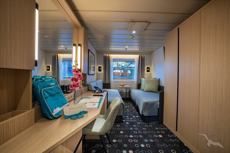 Die 2-Bett-Außenkabinen ohne Sichtbehinderung sind mit großem Fenster (nicht zu öffnen) ausgestattet. Sie verfügen über 2 untere Betten (auf Wunsch zusammenstellbar).