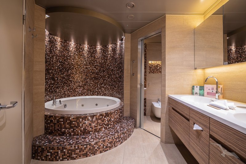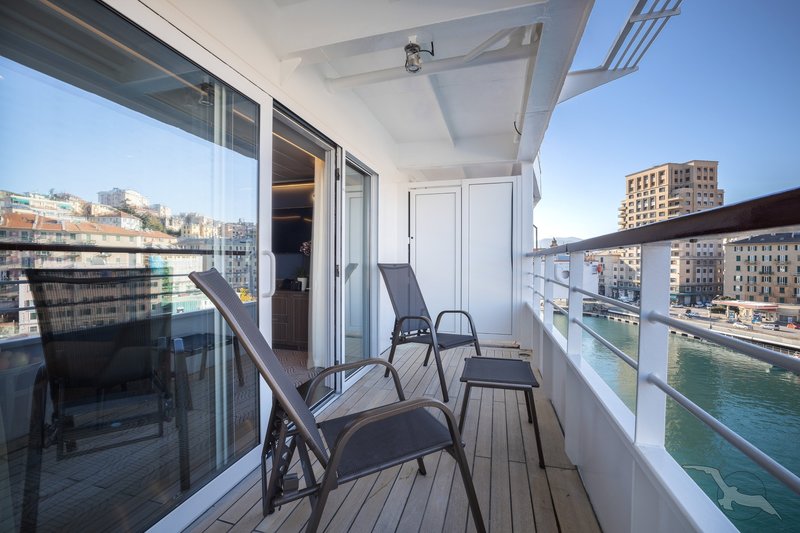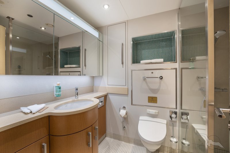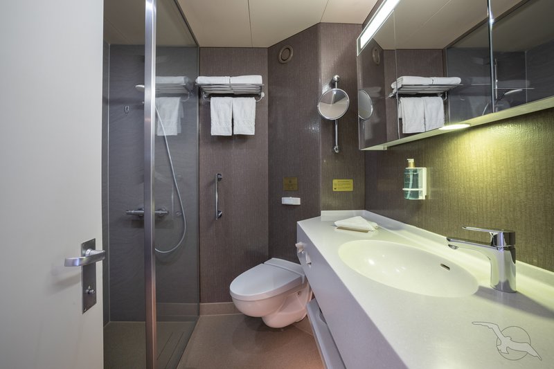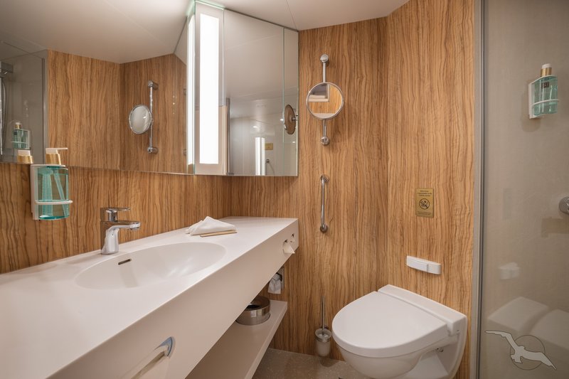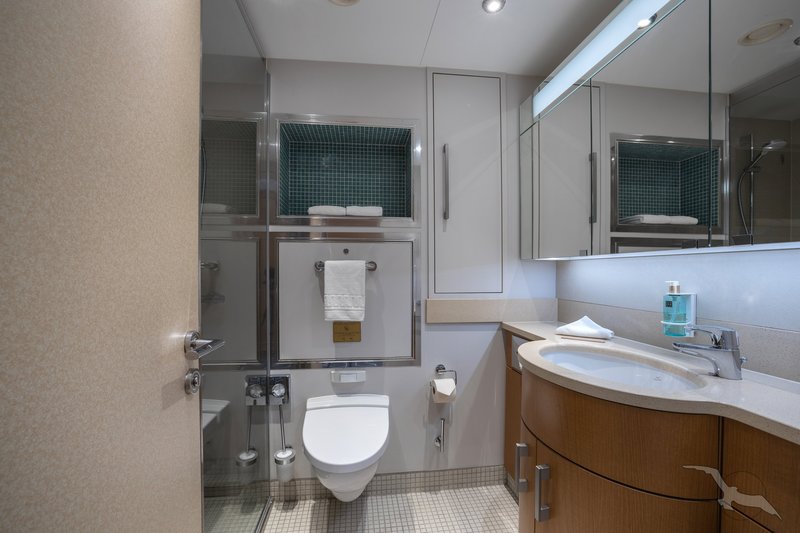 Es gibt einen begehbaren Kleiderschrank, großer Spiegel, kleiner Tisch mit Sofa und Sessel, Kommode mit mehreren Schubfächern, Dusche, WC separat, Duschgel/Shampoo, separates Kosmetik-Set, Bademantel, Slipper, Fön, individuell regulierbare Klimaanlage, 2 SAT-TV (Empfang abhängig vom Fahrgebiet), Bluetooth-Musikbox, Safe, Kaffeemaschine inklusive Kapseln (kostenlos), Minibar mit Getränkeauswahl (kostenlos), 2 hochwertige Ferngläser zur Benutzung an Bord und 3 GB Internetzugang frei (Erneuerung alle 14 Tage; Empfang abhängig vom Fahrgebiet).