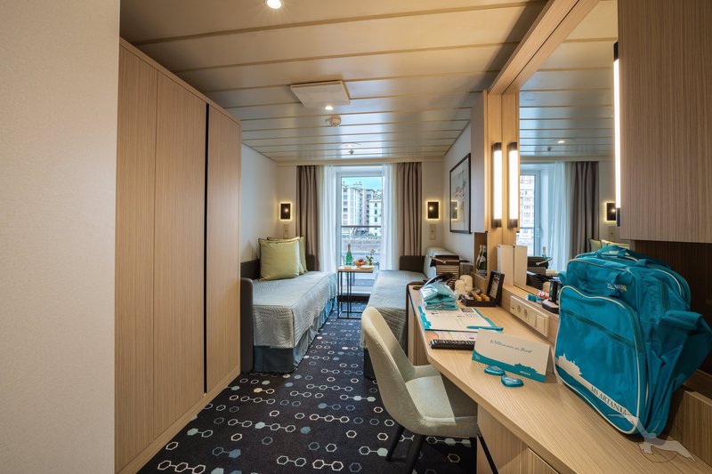 Die 2-Bett-Außenkabinen sind mit Schiebetür zum Privat-Balkon ausgestattet. Sie verfügen über 2 untere Betten (auf Wunsch zusammenstellbar).