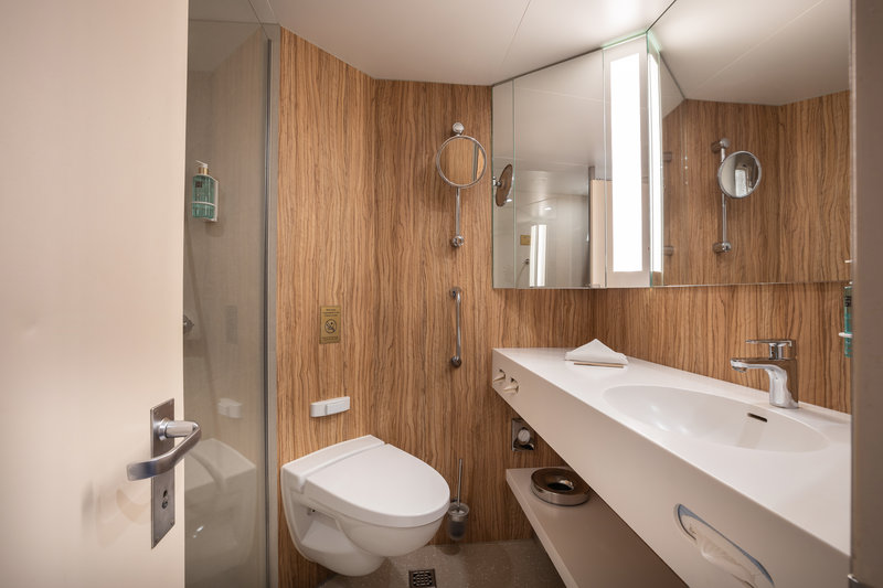 Es gibt 2 große Schränke, Spiegelkommode mit mehreren Schubfächern, Stuhl, Dusche/WC, Duschgel/Shampoo, Bademantel, Fön, SAT-TV (Empfang abhängig vom Fahrgebiet), individuell regulierbare Klimaanlage, Telefon, Minibar, Kaffeemaschine (inklusive Kapseln), Safe, (WLAN nicht inkl., Empfang abhängig vom Fahrgebiet).