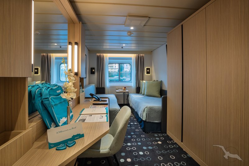 Alle Kabinen auf MS Artania liegen außen, sind geräumig und komfortabel ausgestattet und werden regelmäßig modernisiert. (2019 bzw. 2022 neu gestaltet). Die 2-Bett- und Superior-Kabinen verfügen über zwei untere Betten, die tagsüber als Couch genutzt werden.
