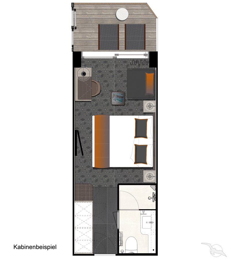 Die Kabinen verfügen über 2 untere Betten und 1 einklappbares Oberbett. Bei Belegung der Kabine mit 2 Personen können die zwei unteren Betten auf Wunsch zusammengestellt werden. Die Reservierung des Zusatzbettes ist nur bei Buchung der gesamten Kabine möglich.