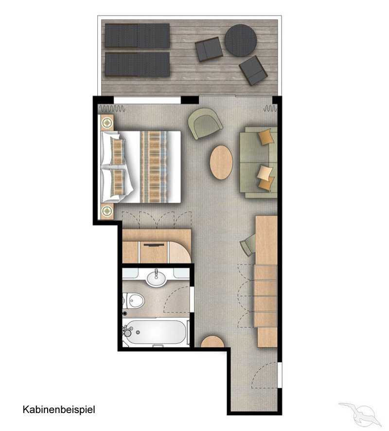 Die elegant möblierten Kabinen verfügen über 2 untere Betten (auf Wunsch zusammenstellbar) und können mit Vorhang vom Wohnbereich abgetrennt werden. Die 2 separaten Sofas sind als zusätzliche Betten nutzbar. Die Reservierung der Zusatzbetten ist nur bei Buchung der gesamten Kabine möglich (Mindestbelegung: 2 Personen, Maximalbelegung: 4 Personen).