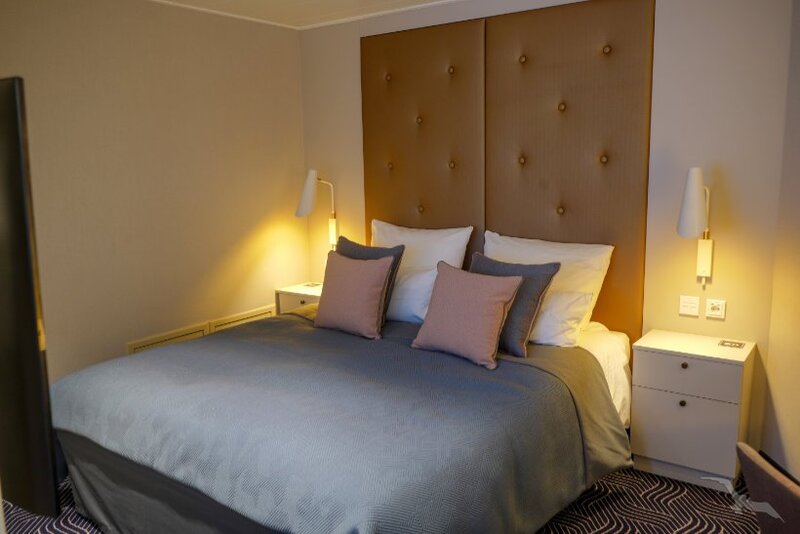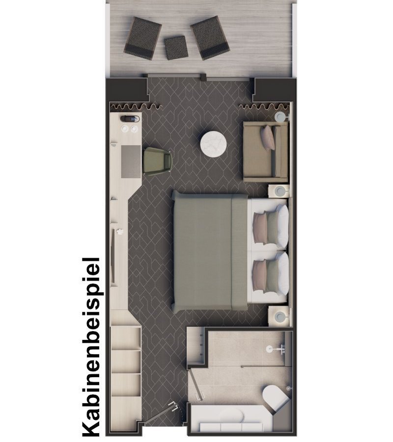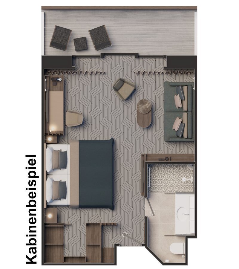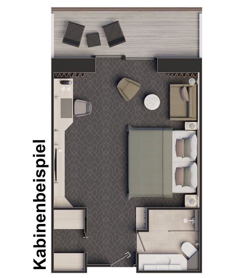 Es gibt 2 großräumige Doppelschränke, kleiner Tisch mit Sofa und Sessel, Spiegelkommode mit Stuhl und mehreren Schubfächern, Wohnwand mit zusätzlichen Schubfächern, Dusche/WC, Duschgel/Shampoo, Bademantel, Fön, SAT-TV (Empfang abhängig vom Fahrgebiet), individuell regulierbare Klimaanlage, Telefon, Minibar, Kaffeemaschine (inklusive Kapseln), Safe, (WLAN nicht inkl., Empfang abhängig vom Fahrgebiet).
