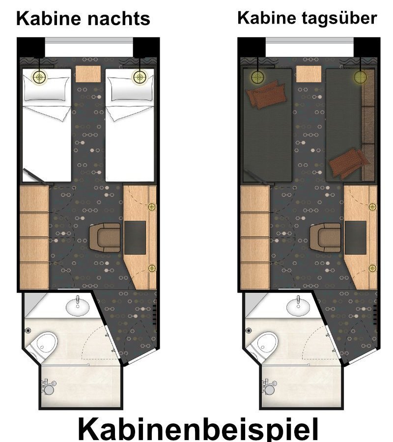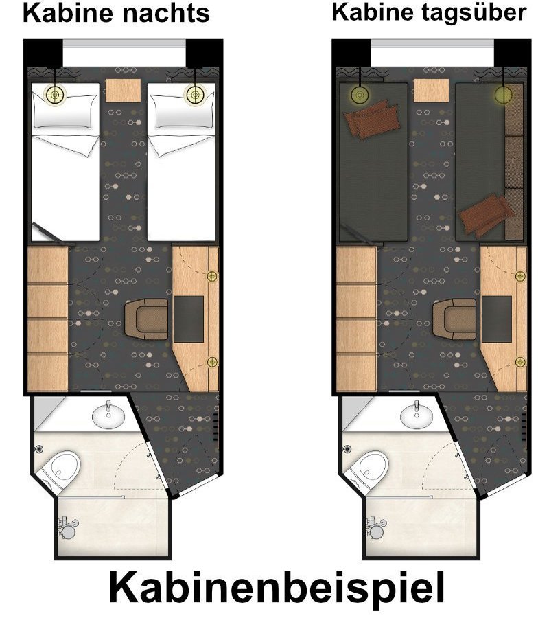 Die elegant möblierten Kabinen verfügen über 2 untere Betten (auf Wunsch zusammenstellbar) und können mit Vorhang vom Wohnbereich abgetrennt werden. Das separate Schlafsofa ist ausziehbar und für zwei weitere Personen buchbar (Mindestbelegung: 2 Personen, Maximalbelegung: 4 Personen). Die Reservierung des Zusatzbettes ist nur bei Buchung der gesamten Kabine möglich.