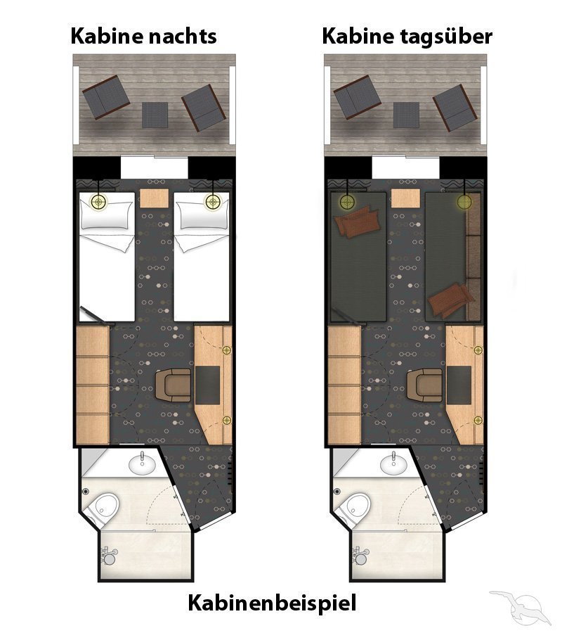 Die Kabinen verfügen über 2 untere Betten (auf Wunsch zusammenstellbar) und einem separater Sessel, welcher zusätzlich als Bett nutzbar ist.