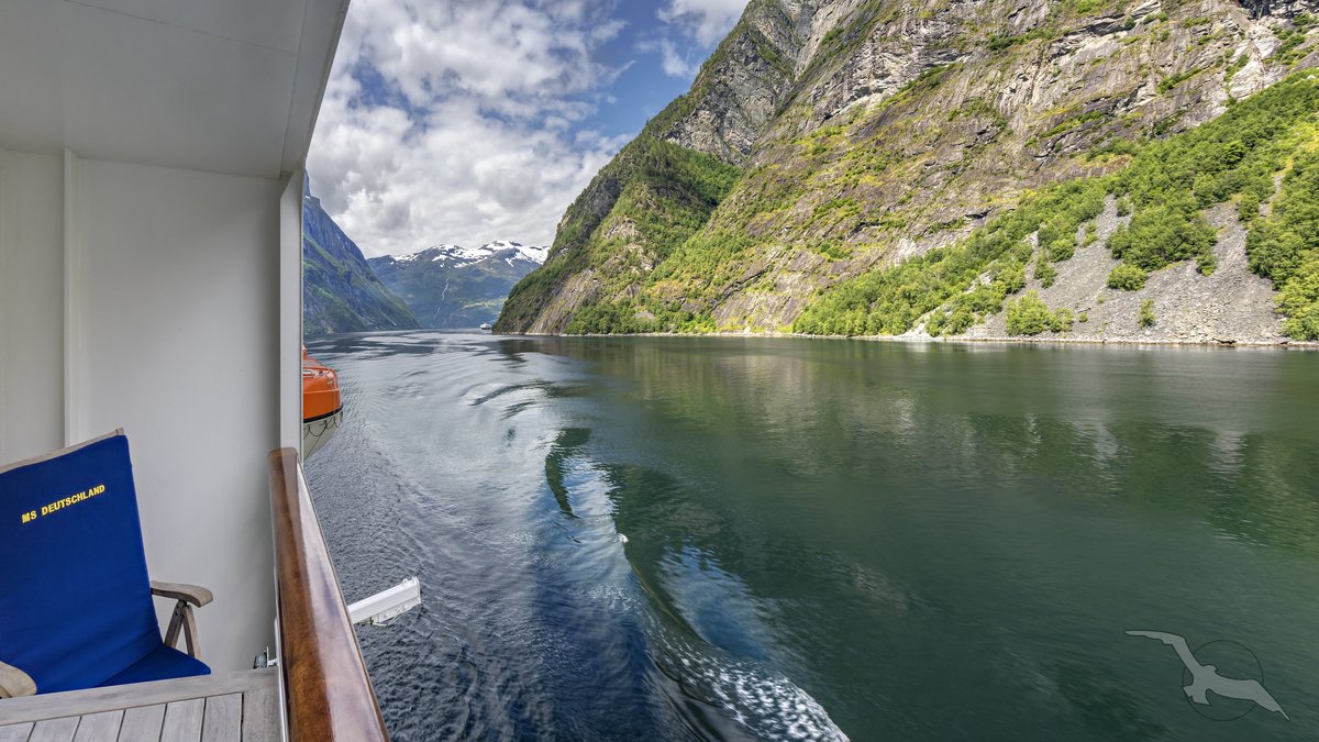 Ein Ausflug für sportliche Gäste. Sie unternehmen einen kleinen Spaziergang vom Schiff zum RIB-Bootsanleger (Schnellschlauchboot). Sie erhalten Schutzkleidung und eine kurze Sicherheitseinweisung. Der Name Geiranger bedeutet "Pfeilspitze", möglicherweise rührt der Name von der Art und Weise, wie sich der Fjord in die Bergwelt schneidet und bis zur kleinen Ortschaft reicht. Seit 2005 steht der Geirangerfjord auf der UNESCO-Liste für Kultur- und Naturerbe. Die beeindruckende Schönheit des Fjordes können Sie während der etwa 50-minütigen Fahrt mit dem RIB-Boot auf besondere Weise erleben. Durch seine windgeschützte Lage weit im Landesinneren ist das Wasser des Geirangerfjords fast immer ruhig und eignet sich daher besonders gut für einen Bootsausflug. Unterwegs werden mehrere Stopps eingelegt.