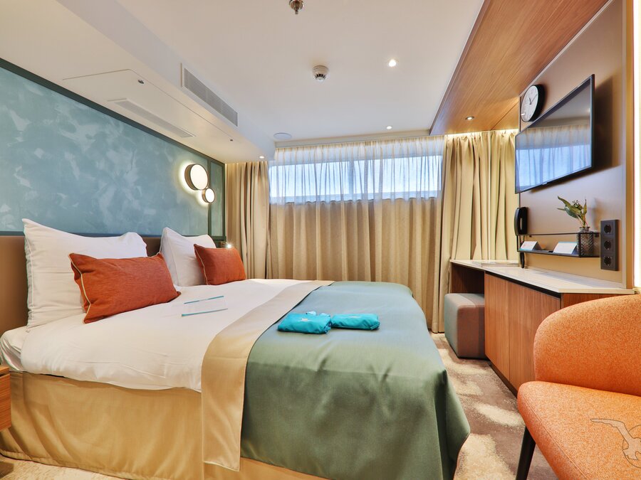 Alle Kabinen liegen außen, sind komfortabel sowie luxuriös eingerichtet und haben einen französischen Balkon. Die Betten lassen sich wahlweise als Doppel- oder Einzelbetten stellen.